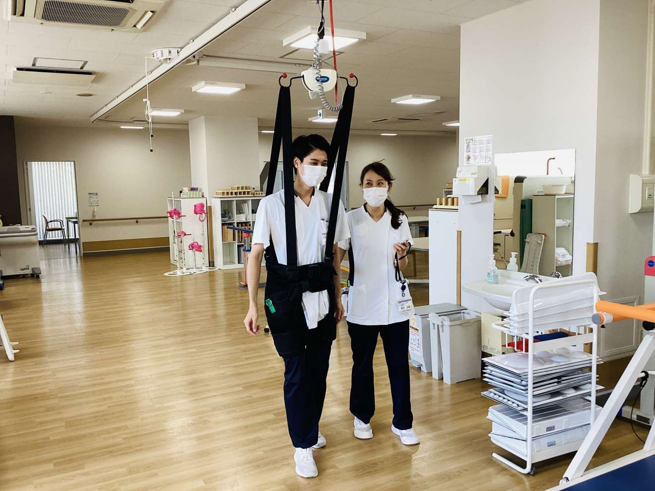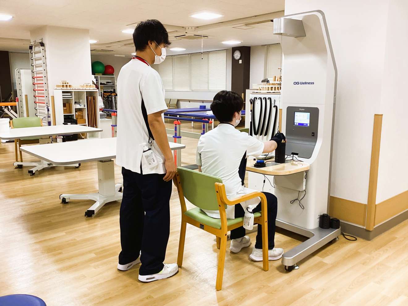 リハビリ室には能動型上肢用他動運動訓練装置であるPhysibo RTD GH-1200や半側空間無視改善ツール@ATTENTION、半側空間無視改善のための評価・リハビリテーションツール@ATTENTION-DS ドライブシミュレーター、レール式安全懸架装置、Power Plate®pro7、入浴シミュレーター等、各種低周波治療器、各種装具の訓練機器に加え、バイタルスティムプラス、ジェントルスティム等の嚥下障害の治療機器もそろえて、住み慣れた地域に安心して戻っていけるよう患者様の機能改善、能力改善に努めております。