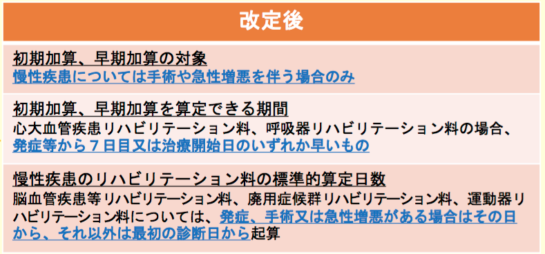 心大血管疾患リハビリテーション料、脳血管疾患等リハビリテーション料、運動器リハビリテーション料、呼吸器リハビリテーション料、廃用症候群リハビリテーション料の算定患者のうち入院中等のもの(急性疾患、手術、及び慢性疾患の急性増悪等の患者に限る。(追加))