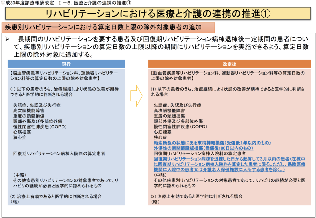 別表第九の八第一号 失語症、失認及び失行症の患者 高次脳機能障害の患者 重度の頚髄損傷の患者 頭部外傷及び多部位外傷の患者 慢性閉塞性肺疾患(COPD)の患者 心筋梗塞の患者 狭心症の患者 軸索断裂の状態にある末梢神経損 … 続きを読む 別表第九の八 疾患別リハビリに規定する算定日数の上限の除外対象患者