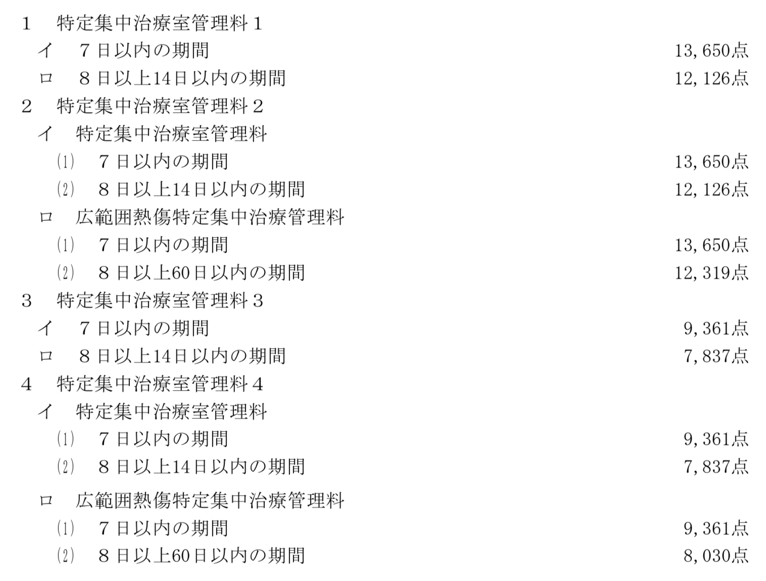 注1 別に厚生労働大臣が定める施設基準に適合しているものとして地方厚生局長等に届け出た保険医療機関において、必要があって特定集中治療室管理が行われた場合に、当該基準に係る区分及び当該患者の状態について別に厚生労働大臣が定める区分(特定集中治療室管理料2及び4に限る。)に従い、14日(別に厚生労働大臣が定める状態の患者(特定集中治療室管理料2及び4に係る届出を行った保険医療機関に入院した患者に限る。)にあっては60日)を限度として、それぞれ所定点数を算定する。