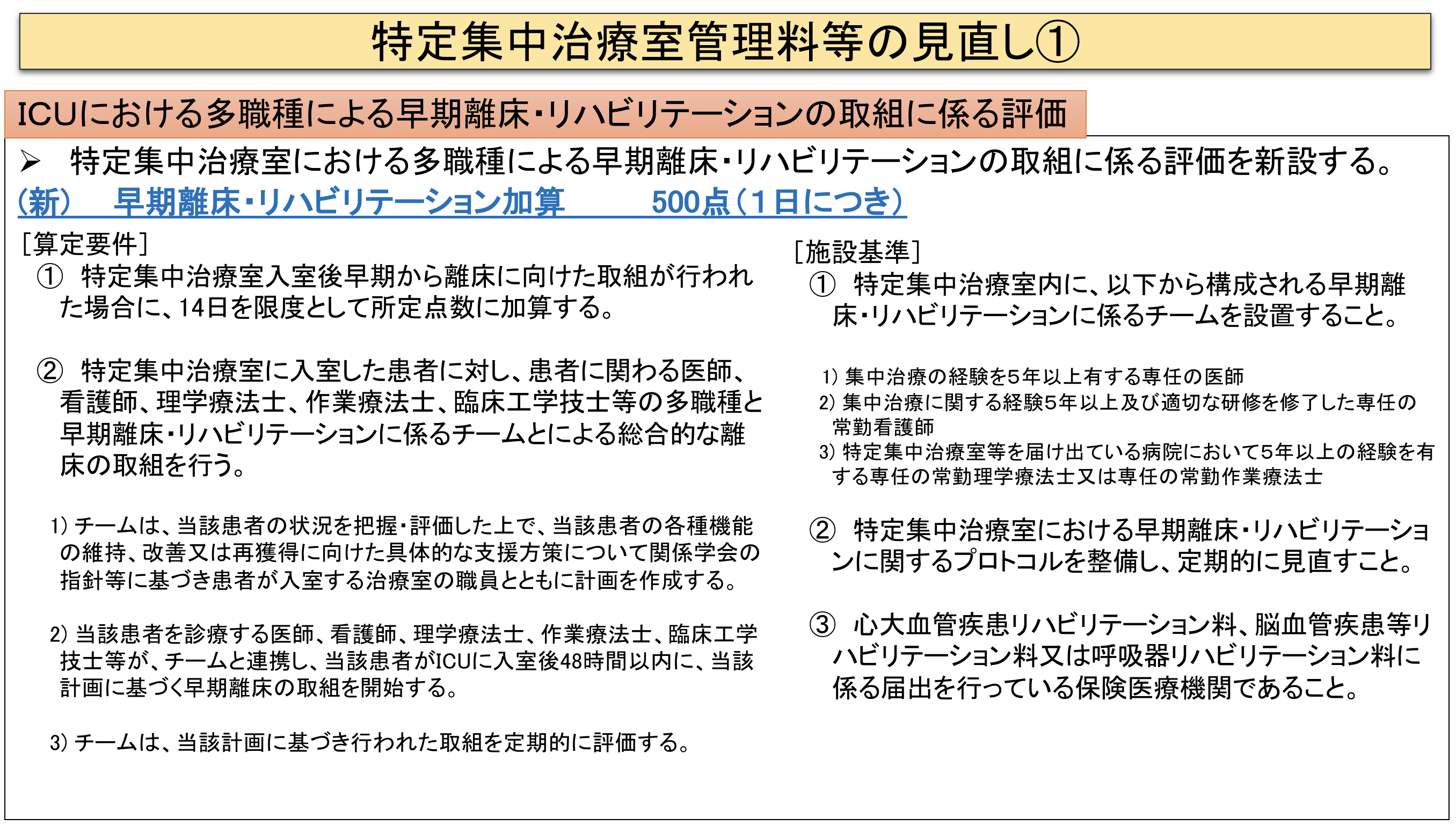 注4「注4」に掲げる早期離床・リハビリテーション加算は、特定集中治療室に入室した患者に対し、患者に関わる医師、看護師、理学療法士、作業療法士又は臨床工学技士等の多職種と早期離床・リハビリテーションに係るチーム(以下「早期離床・リハビリテーションチーム」という。)による以下のような総合的な離床の取組を行った場合の評価である。