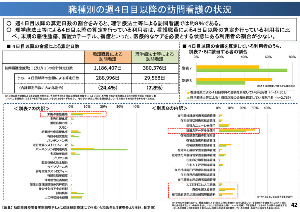 - 理学療法士等による訪問看護について、週4日目以降の評価を見直す。