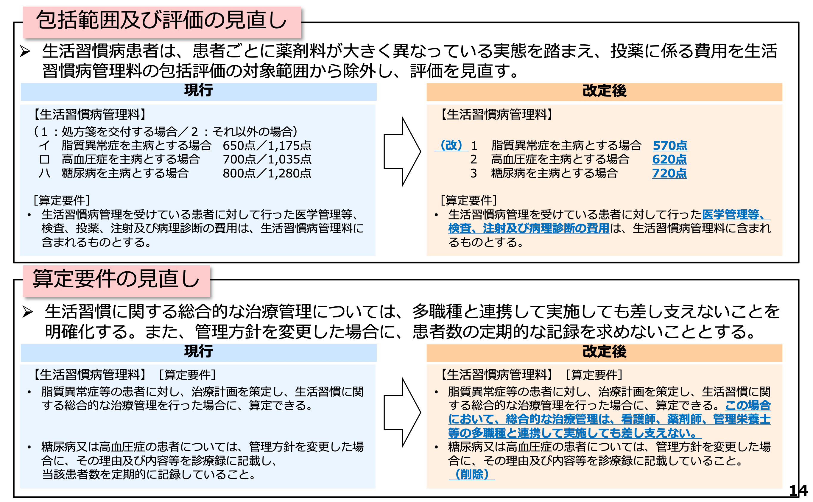 注2 生活習慣病管理を受けている患者に対して行った第2章第1部医学管理等(区分番号B001の20に掲げる糖尿病合併症管理料、区分番号B001の22に掲げるがん性疼痛緩和指導管理料、区分番号B001の24に掲げる外来緩和ケア管理料及び区分番号B001の27に掲げる糖尿病透析予防指導管理料を除く。)、第3部検査、第6部注射及び第13部病理診断の費用は、生活習慣病管理料に含まれるものとする。
