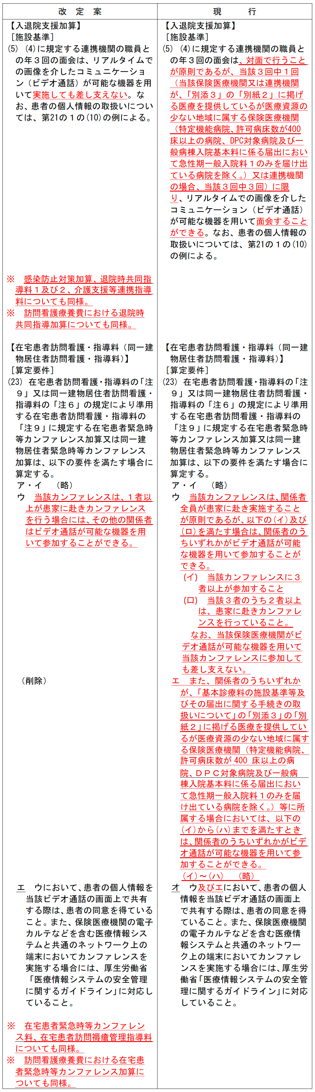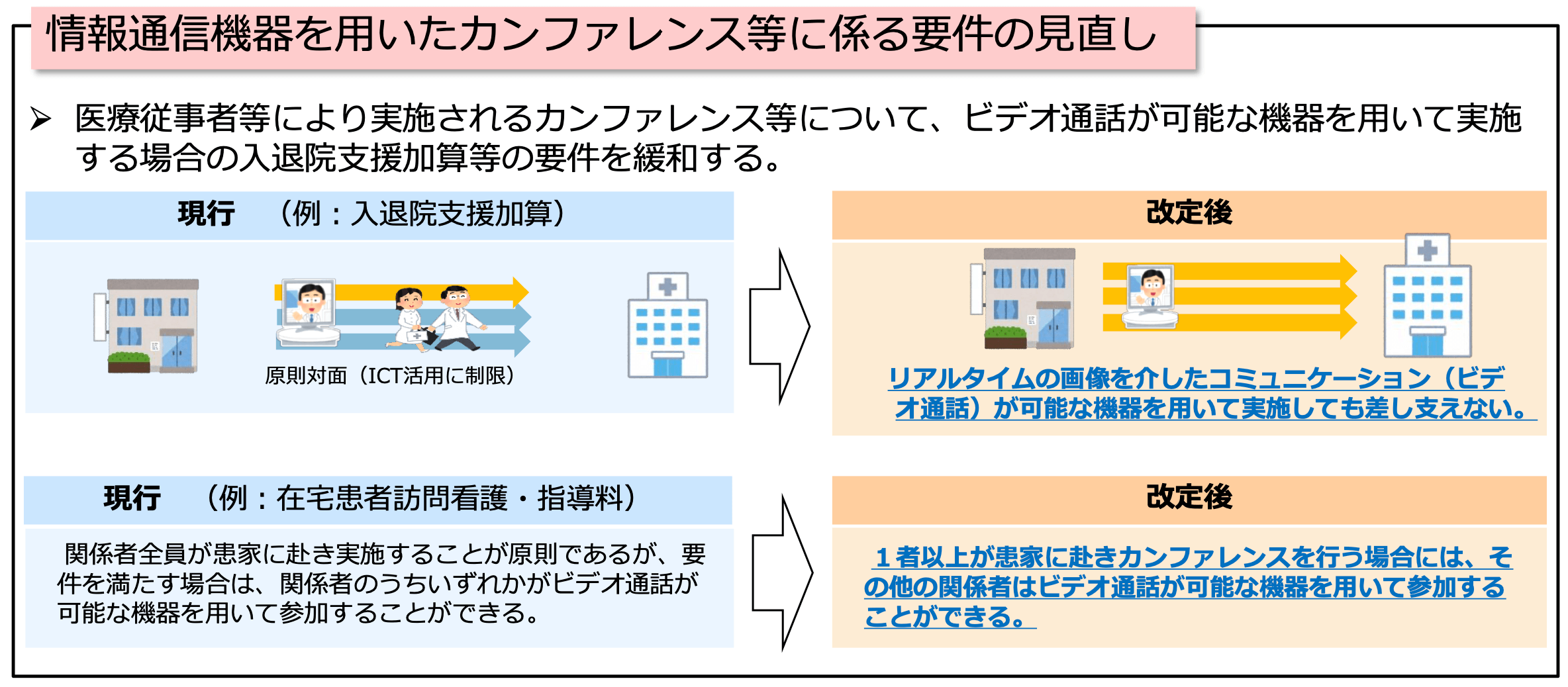 医療従事者等により実施されるカンファレンス等について、ビデオ通話が可能な機器を用いて、対面によらない方法で実施する場合の入退院支援加算等の要件を緩和する。