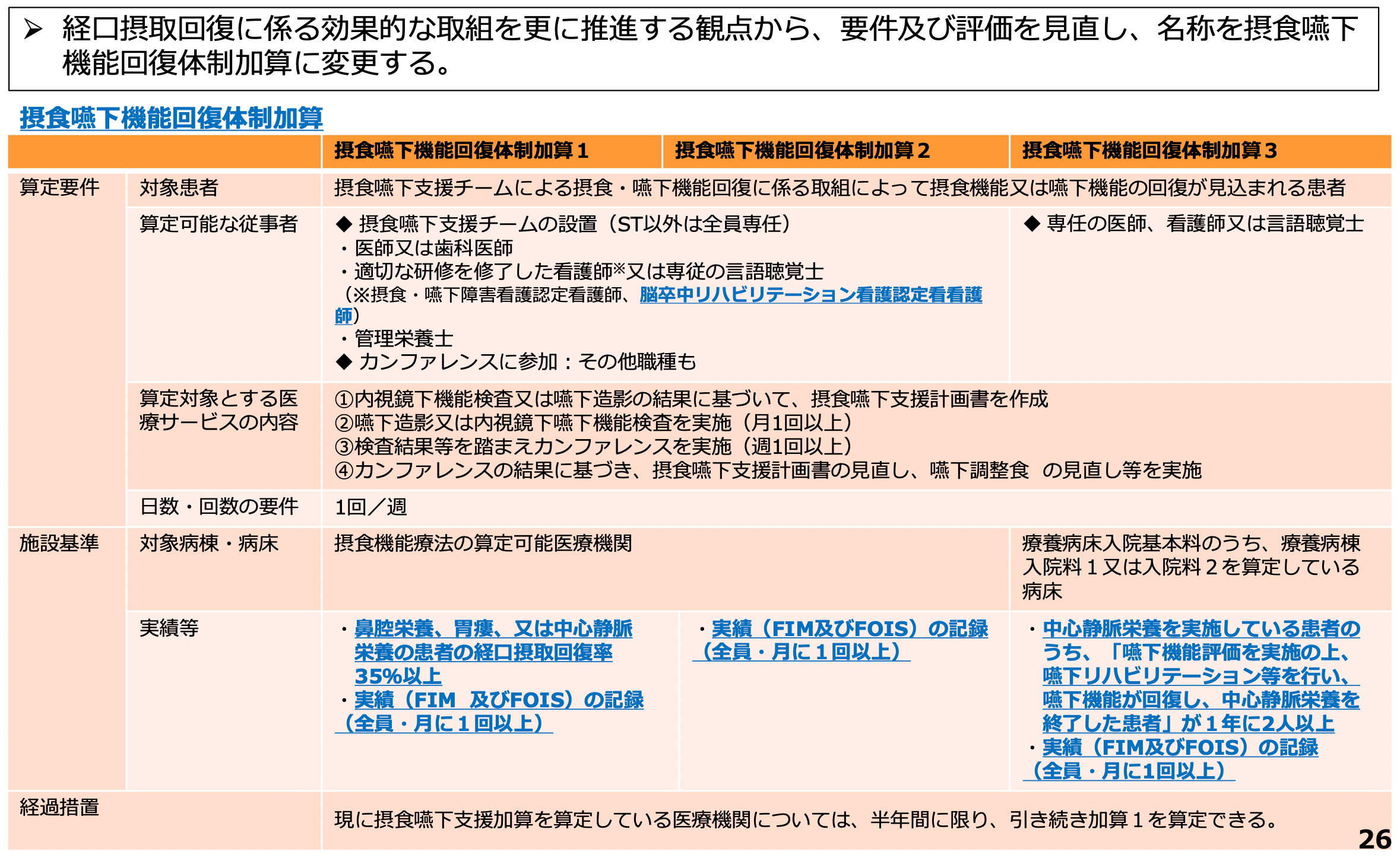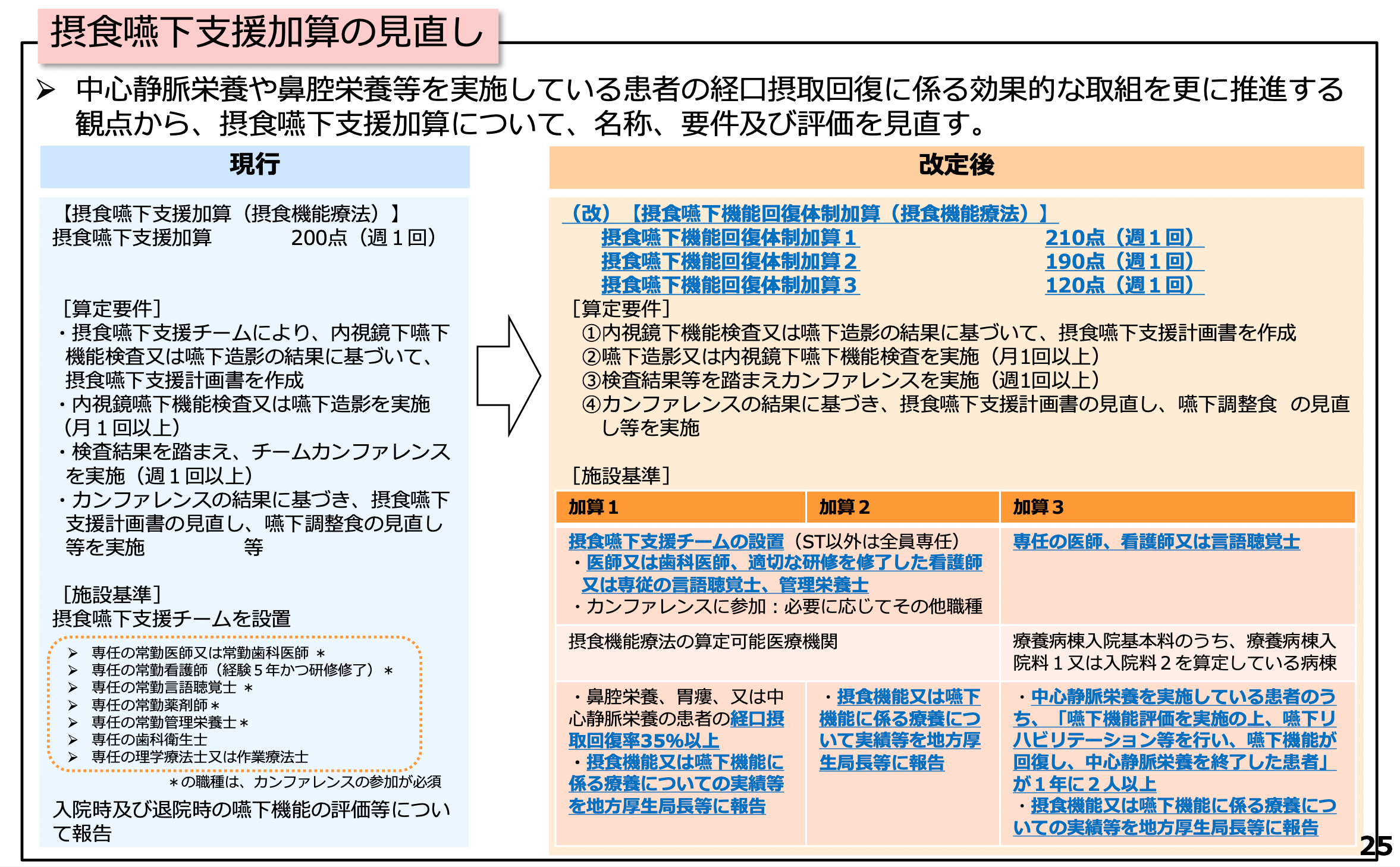 中心静脈栄養や鼻腔栄養等を実施している患者の経口摂取回復に係る効果的な取組を更に推進する観点から、摂食嚥下支援加算について、名称、要件及び評価を見直す。(詳細)