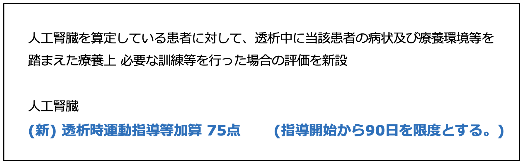 人工腎臓を算定している患者に対して、病状及び療養環境等を踏まえた療養上の必要な訓練等を行った場合に透析時運動指導等加算として、指導開始から90日を限度に75点が算定出来るようになりました。