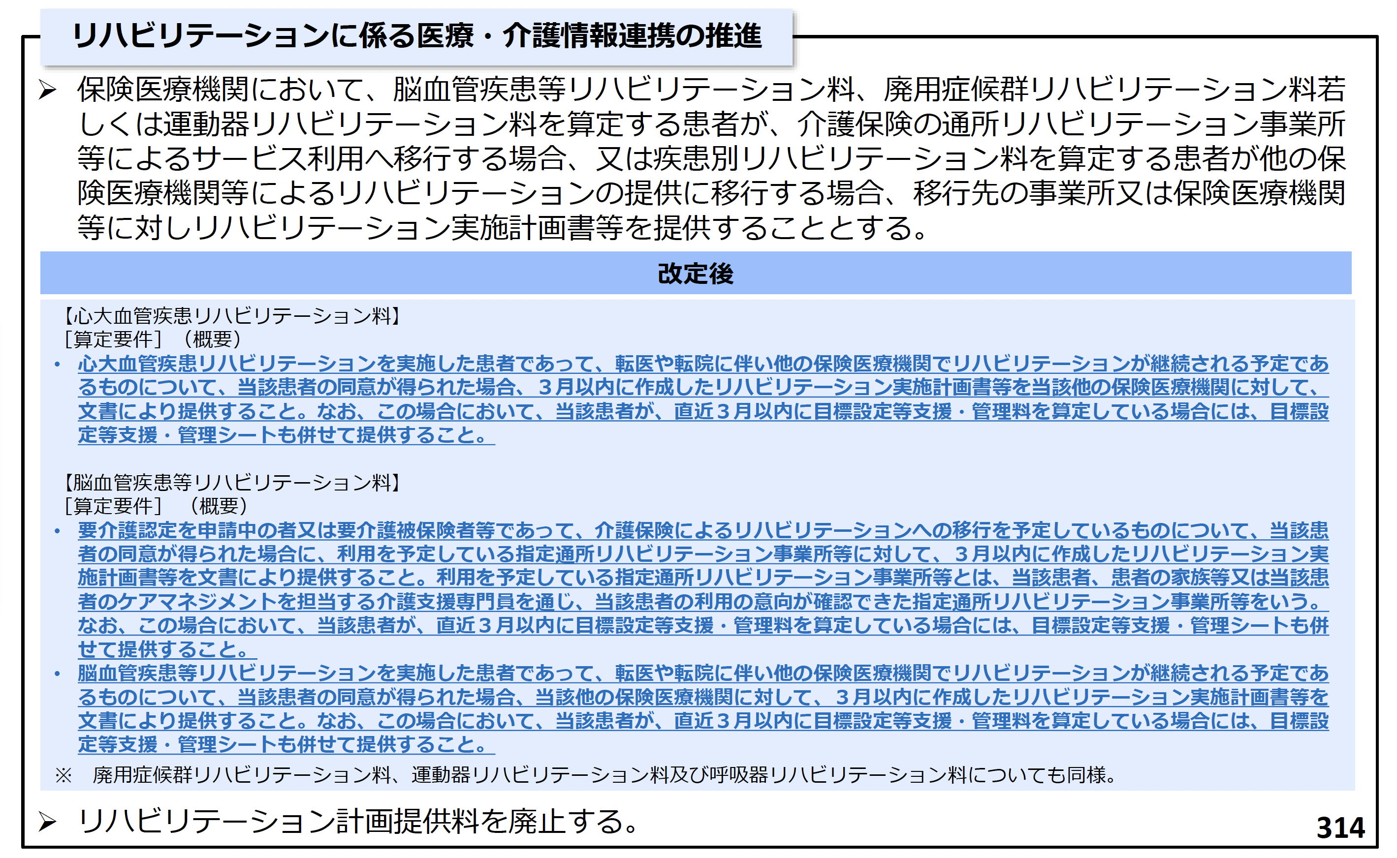 1.保険医療機関において、脳血管疾患等リハビリテーション料、廃用症候群リハビリテーション料若しくは運動器リハビリテーション料を算定する患者が、介護保険の通所リハビリテーション事業所等によるサービス利用へ移行する場合、又は疾患別リハビリテーション料を算定する患者が他の保険医療機関等によるリハビリテーションの提供に移行する場合、移行先の事業所又は保険医療機関等に対しリハビリテーション実施計画書を提供することとする。