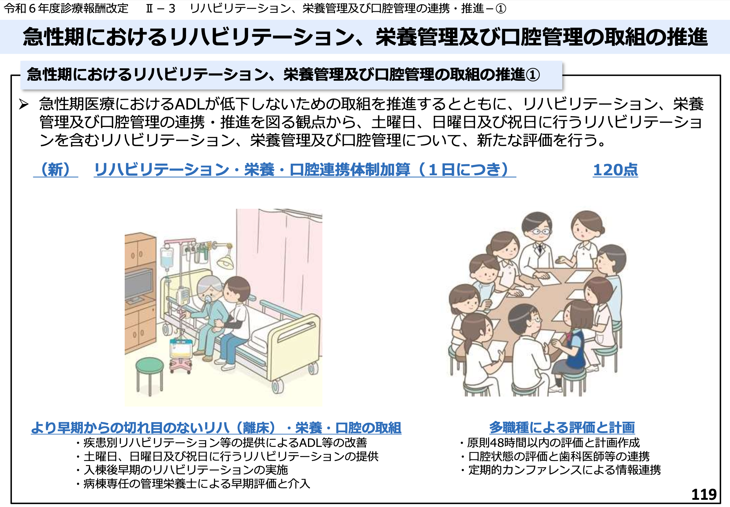 急性期医療におけるADLが低下しないための取組を推進するとともに、リハビリテーション、栄養管理及び口腔管理の連携・推進を図る観点から、土曜日、日曜日及び祝日に行うリハビリテーションを含むリハビリテーション、栄養管理及び口腔管理について、入院した患者全員に対し、入院後48時間以内にADL、栄養状態及び口腔状態に関する評価を行い、リハビリテーション、栄養管理及び口腔管理に係る計画の作成及び計画に基づく多職種による取組を行う体制の確保に係る評価としてリハビリテーション・栄養・口腔連携体制加算を新設するとともに、ADL維持向上等体制加算を廃止する。