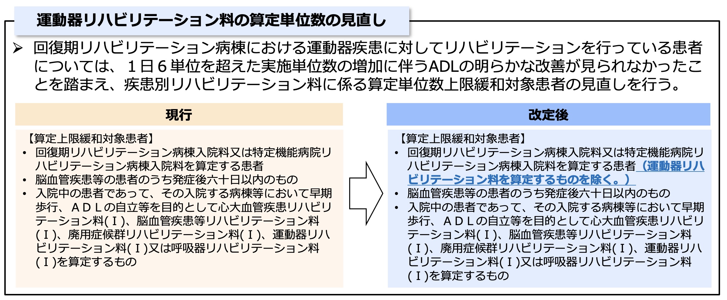 回復期リハビリテーション病棟における運動器疾患に対してリハビリテーションを行っている患者については、1日6単位を超えた実施単位数の増加に伴うADLの明らかな改善が見られなかったことを踏まえ、運動器リハビリテーション料に係る算定単位数の上限が緩和される対象患者を見直す。