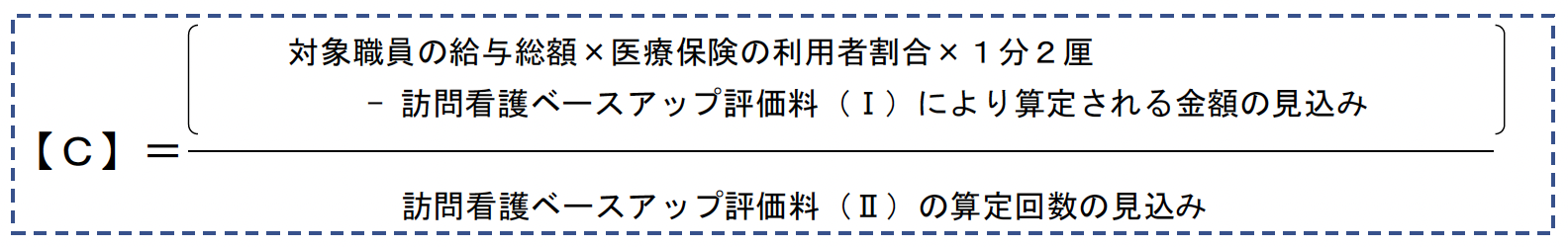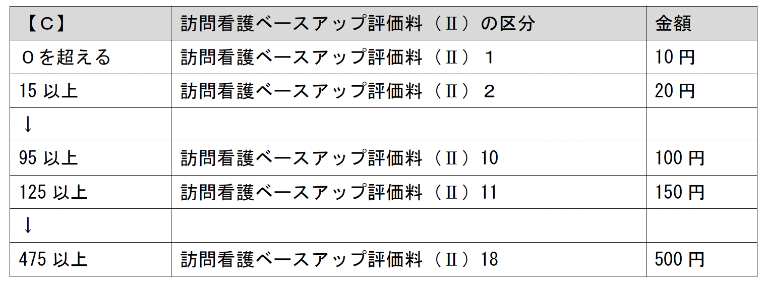 (3)訪問看護ベースアップ評価料(Ⅱ)の訪問看護ステーションごとの区分については、当該訪問看護ステーションにおける対象職員の給与総額、訪問看護ベースアップ評価料(Ⅰ)により算定される金額の見込み並びに訪問看護ベースアップ評価料(Ⅱ)の算定回数の見込みを用いて算出した数【C】に基づき、別表4に従い該当する区分のいずれかを届け出ること。