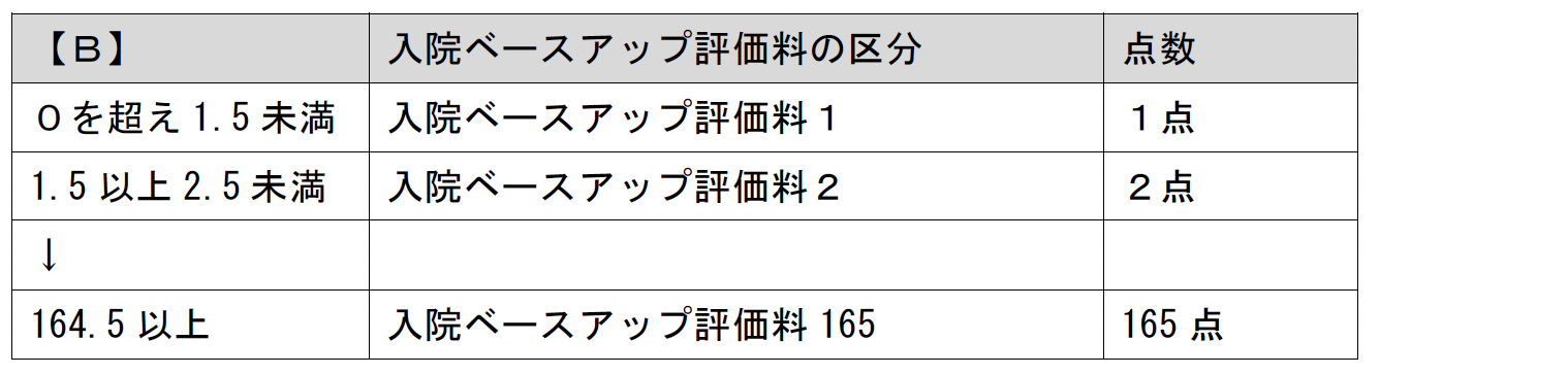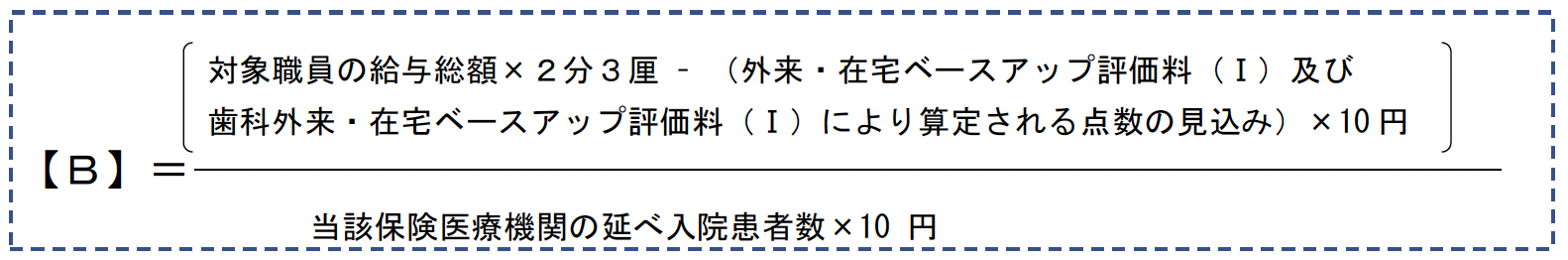 (5)入院ベースアップ評価料の保険医療機関ごとの点数については、当該保険医療機関における対象職員の給与総額、外来・在宅ベースアップ評価料(Ⅰ)及び歯科外来・在宅ベースアップ評価料(Ⅰ)により算定される点数の見込み並びに延べ入院患者数(入院基本料、特定入院料又は短期滞在手術等基本料を算定している患者の延べ人数をいう。以下同じ。)の見込みを用いて次の式により算出した数【B】に基づき、別表3に従い該当する区分を届け出ること。