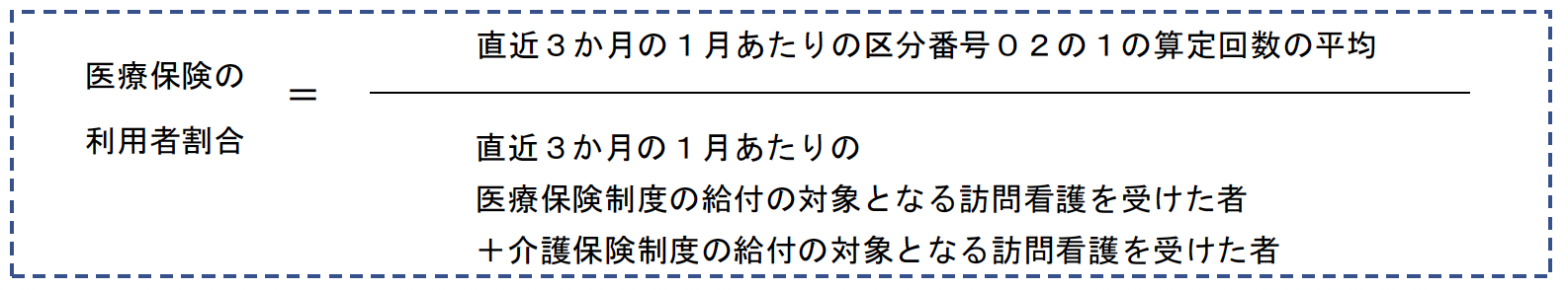 (2)訪問看護ベースアップ評価料(Ⅰ)により算定される金額の見込みの数が、対象職員の給与総額から当該訪問看護ステーションの利用者の数に占める医療保険制度の給付の対象となる訪問看護を受けた者の割合(以下「医療保険の利用者割合」とする。)を乗じた数の1分2厘未満であること。ただし、同一月に医療保険制度と介護保険制度の給付の対象となる訪問看護を受けた者については、医療保険制度の給付による場合として取り扱うこと。