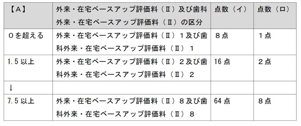 (4)歯科外来・在宅ベースアップ評価料(Ⅱ)の保険医療機関ごとの区分については、当該保険医療機関における対象職員の給与総額、外来・在宅ベースアップ評価料(Ⅰ)及び歯科外来・在宅ベースアップ評価料(Ⅰ)により算定される点数の見込み並びに外来・在宅ベースアップ評価料(Ⅱ)及び歯科外来・在宅ベースアップ評価料(Ⅱ)の算定回数の見込みを用いて算出した数【A】に基づき、別表2に従い該当する区分のいずれかを届け出ること。ただし、外来・在宅ベースアップ評価料(Ⅱ)の施設基準の届出を行う保険医療機関については、同一の区分を届け出ること。
