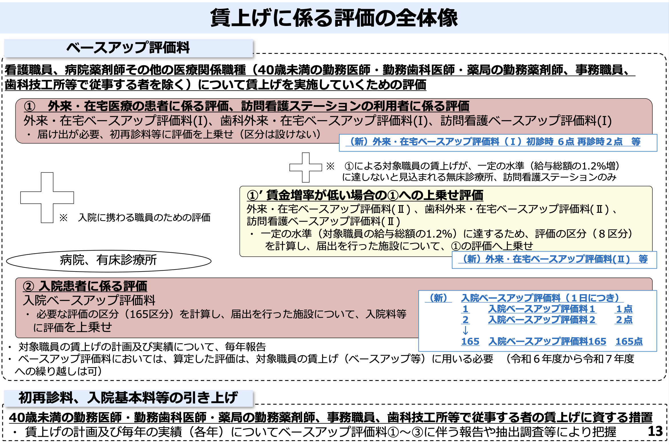 主として医療に従事する職員(医師及び歯科医師を除く。以下「対象職員」という。)の賃金の改善を図る体制につき別に厚生労働大臣が定める施設基準に適合しているものとして地方厚生局長等に届け出た保険医療機関に入院している患者であって、第1章第2部第1節の入院基本料(特別入院基本料等を含む。)、同部第3節の特定入院料又は同部第4節の短期滞在手術等基本料(短期滞在手術等基本料1を除く。)を算定している患者について、当該基準に係る区分に従い、それぞれ所定点数を算定する。