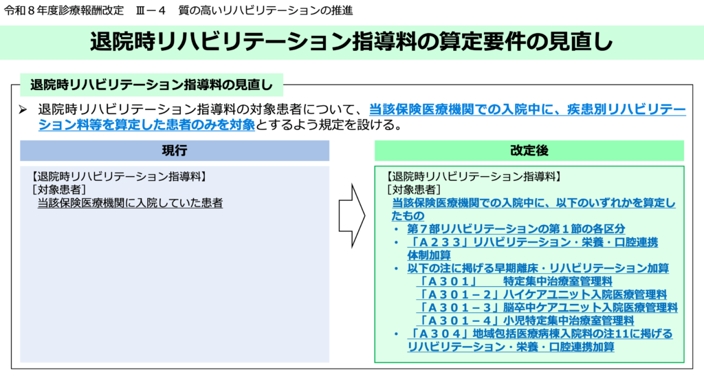 (1) 退院時リハビリテーション指導料は、入院していた患者(当該保険医療機関での入院中に、「A233」のリハビリテーション・栄養・口腔連携体制加算、「A301」注4の早期離床・リハビリテーション加算、「A301-2」注3の早期離床・リハビリテーション加算、「A301-3」注3の早期離床・リハビリテーション加算、「A301-4」注3の早期離床・リハビリテーション加算、「A304」注11のリハビリテーション・栄養・口腔連携加算、第7部リハビリテーションの第1節の区分のいずれかを算定したものに限る。)の退院に際し、患者の病状、患家の家屋構造、介護力等を考慮しながら、患者又はその家族等退院後患者の看護に当たる者に対して、リハビリテーションの観点から退院後の療養上必要と考えられる指導を行った場合に算定する。