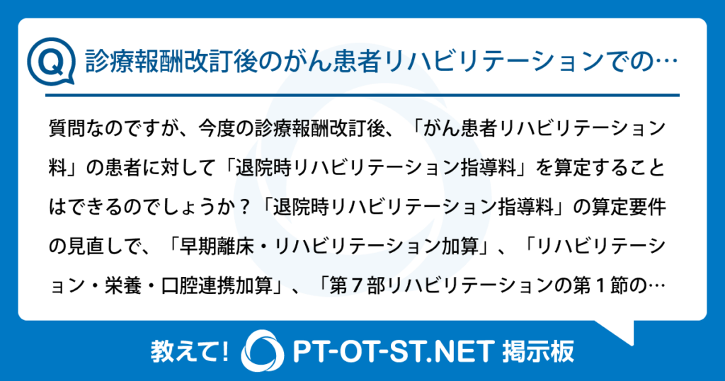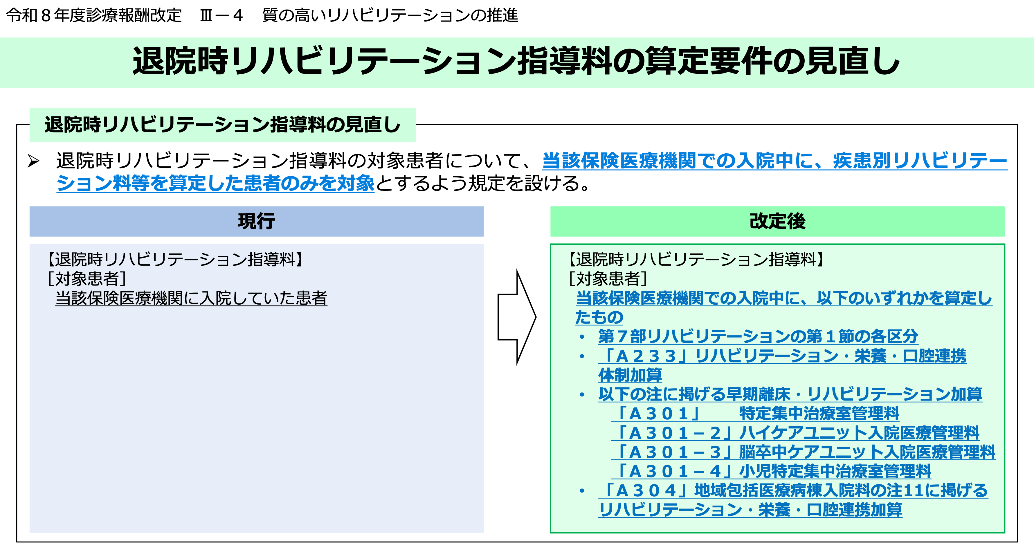 | 【退院時リハビリテーション指導料】 [算定要件] 注 患者の退院時に当該患者 (当該保険医療機関での入院中に、区分番号A233に掲げるリハビリテーション・栄養・口腔連携体制加算、区分番号A301の注4に掲げる早期離床・リハビリテーション加算、区分番号A301-2の注3に掲げる早期離床・リハビリテーション加算、区分番号A301-3の注3に掲げる早期離床・リハビリテーション加算、区分番号A301-4の注3に掲げる早期離床・リハビリテーション加算、区分番号A304の注10に掲げるリハビリテーション・栄養・口腔連携加算又は第7部リハビリテーションの第1節の各区分のいずれかを算定したものに限る。) 又はその家族等に対して、退院後の在宅での基本的動作能力若しくは応用的動作能力又は社会的適応能力の回復を図るための訓練等について必要な指導を行った場合に算定する。この場合において、同一日に、区分番号B005に掲げる退院時共同指導料2(注1の規定により、入院中の保険医療機関の理学療法士、作業療法士又は言語聴覚士が指導等を行った場合に限る。)は、別に算定できない。 | 【退院時リハビリテーション指導料】 [算定要件] 注 患者の退院時に当該患者又はその家族等に対して、退院後の在宅での基本的動作能力若しくは応用的動作能力又は社会的適応能力の回復を図るための訓練等について必要な指導を行った場合に算定する。この場合において、同一日に、区分番号B005に掲げる退院時共同指導料2(注1の規定により、入院中の保険医療機関の理学療法士、作業療法士又は言語聴覚士が指導等を行った場合に限る。)は、別に算定できない。 |