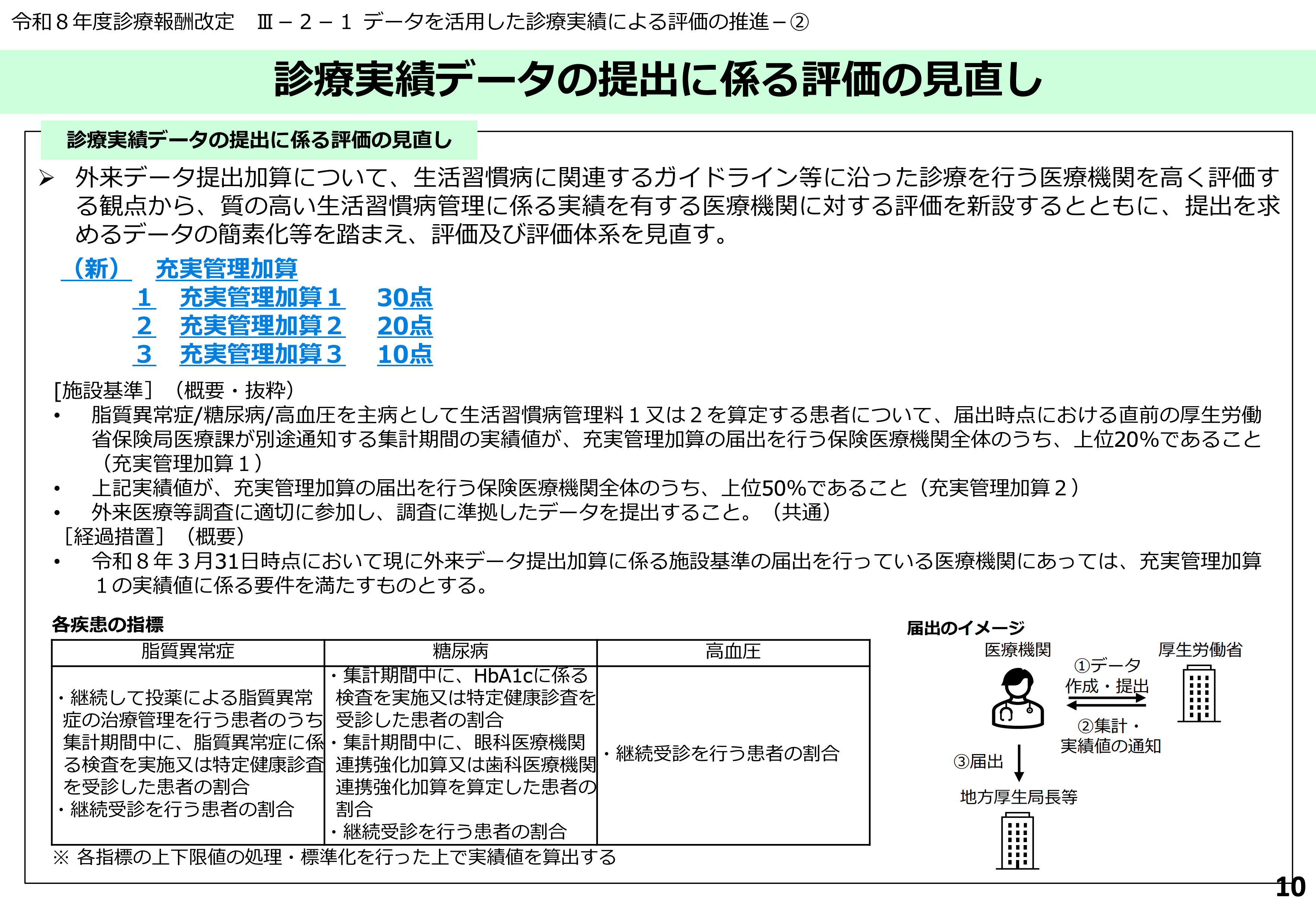 外来データ提出加算について、生活習慣病に関連するガイドライン等に沿った診療を行う医療機関を高く評価する観点から、診療報酬の請求状況、治療管理の状況等の診療の内容に関するデータを提出した医療機関のうち、質の高い生活習慣病管理に係る実績を有する医療機関に対する評価を新設するとともに、提出を求めるデータの簡素化等を踏まえ、評価及び評価体系を見直す。