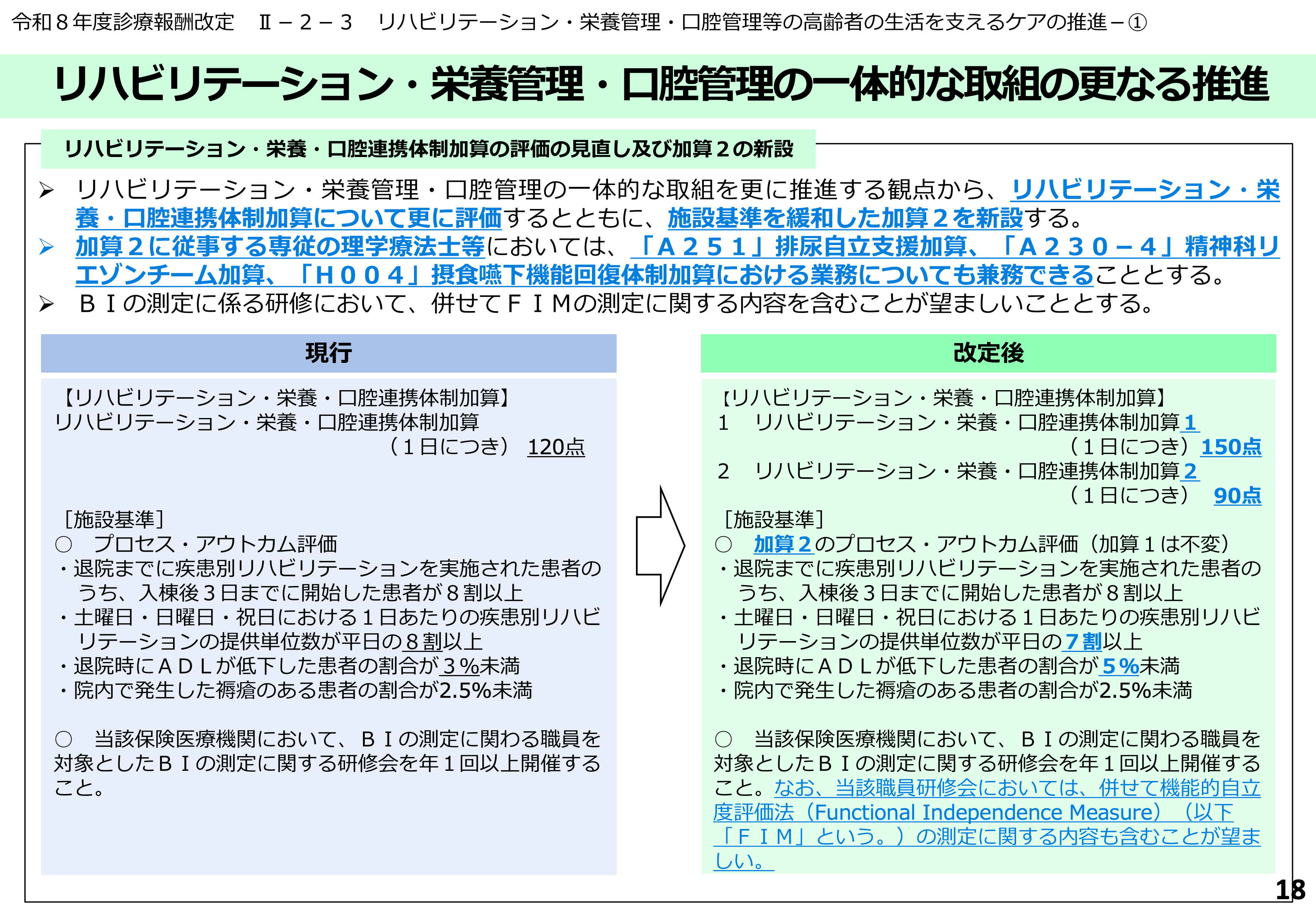 | 第18の2 リハビリテーション・栄養・口腔連携体制加算 1 リハビリテーション・栄養・口腔連携体制加算1に関する施設基準 (1)~(5)(略) (6) プロセス・アウトカム評価として、以下のア~エの基準を全て満たすこと。 ア~エ(略) (7)~(9)(略) (10) 当該保険医療機関において、BIの測定に関わる職員を対象としたBIの測定に関する研修会を年1回以上開催すること。なお、当該職員研修会においては、併せて機能的自立度評価法(Functional Independence Measure)(以下「FIM」という。)の測定に関する内容も含むことが望ましい。 2 リハビリテーション・栄養・口腔連携体制加算2に関する施設基準 (1) 1の(1)、(3)から(5)まで及び(7)から(10)までの基準を満たしていること。 (2) 当該病棟に、専従の常勤理学療法士等が2名以上配置されている。なお、うち1名は専任の従事者でも差し支えない。複数の病棟において当該加算の届出を行う場合には、病棟ごとにそれぞれ専従の理学療法士等が配置されていること。また、当該理学療法士等(専従のものに限る。)は、「H000」心大血管疾患リハビリテーション料、「H001」脳血管疾患等リハビリテーション料、「H001-2」廃用症候群リハビリテーション料、「H002」運動器リハビリテーション料、「H003」呼吸器リハビリテーション料、「H004」摂食機能療法、「H005」視能訓練、「H006」難病患者リハビリテーション料、「H007」障害児(者)リハビリテーション料、「H007-2」がん患者リハビリテーション料、「H007-3」認知症患者リハビリテーション料及び「H008」集団コミュニケーション療法料(以下「疾患別リハビリテーション等」という。)を担当する専従者との兼務はできないものであること。 ただし、当該病棟内に「A308」回復期リハビリテーション入院医療管理料又は「A308-3」地域包括ケア入院医療管理料1から4までのいずれかを算定する病室がある場合には、当該病室における理学療法士等の業務について兼務しても差し支えない。また、リハビリテーション・栄養・口腔連携体制加算2における専従の理学療法士等においては、「A251」排尿自立支援加算、「A230-4」精神科リエゾンチーム加算及び「H004」摂食嚥下機能回復体制加算における理学療法士等の業務についても兼務して差し支えない。 (3) プロセス・アウトカム評価として、以下のアからウまでの基準を全て満たすこと。 ア 1の(6)のア及びエを満たすこと。 イ 直近1年間に、当該病棟の入棟患者に対する土曜日、日曜日又は祝日における1日あたりの疾患別リハビリテーション料の提供単位数から、当該病棟の入棟患者に対する平日における1日あたりの疾患別リハビリテーション料の提供単位数を除した割合が7割以上であること。 ウ 直近1年間に、当該病棟を退院又は転棟した患者(死亡退院及び終末期のがん患者等を除く。)のうち、退院又は転棟時におけるADLが入院時と比較して低下した患者の割合が5%未満であること。 3 届出に関する事項 リハビリテーション・栄養・口腔連携体制加算1及び2の施設基準に係る届出は、別添7の様式5の5を用いること。1の(6)のアからウまで及び2の(3)のアからウまで(1の(6)のエに係るものを除く。)の実績については、新規に届出をする場合は、直近3月間の実績が施設基準を満たす場合、届出することができる。また、施設基準を満たさなくなったため所定点数を加算できなくなった後、再度届出を行う場合については、新規に届出をする場合には該当しない。また、届出以降は、前年度1年間の1の(6)のアからエまで又は2の(3)のアからウまでの実績を毎年8月に別添7の様式5の5の2を用いて、地方厚生(支)局長に報告すること。 ※ 地域包括医療病棟入院料の注10に規定するリハビリテーション・栄養・口腔連携加算についても同様 | 第18の2 リハビリテーション・栄養・口腔連携体制加算 1 リハビリテーション・栄養・口腔連携体制加算に関する施設基準 (1)~(5)(略) (6) プロセス・アウトカム評価として、以下のア~エの基準を全て満たすこと。なお、ア~ウについて、新規に届出をする場合は、直近3月間の実績が施設基準を満たす場合、届出することができる。 ア~エ(略) (7)~(9)(略) (10) 当該保険医療機関において、BIの測定に関わる職員を対象としたBIの測定に関する研修会を年1回以上開催すること。 (新設) 2 届出に関する事項 リハビリテーション・栄養・口腔連携体制加算の施設基準に係る届出は、別添7の様式5の5を用いること。1の(6)のア~ウの実績については、新規に届出をする場合は、直近3月間の実績が施設基準を満たす場合、届出することができる。また、施設基準を満たさなくなったため所定点数を加算できなくなった後、再度届出を行う場合については、新規に届出をする場合には該当しない。また、届出以降は、前年度1年間の1の(6)のアからエの実績を毎年8月に別添7の様式5の5の2を用いて、地方厚生(支)局長に報告すること。 |