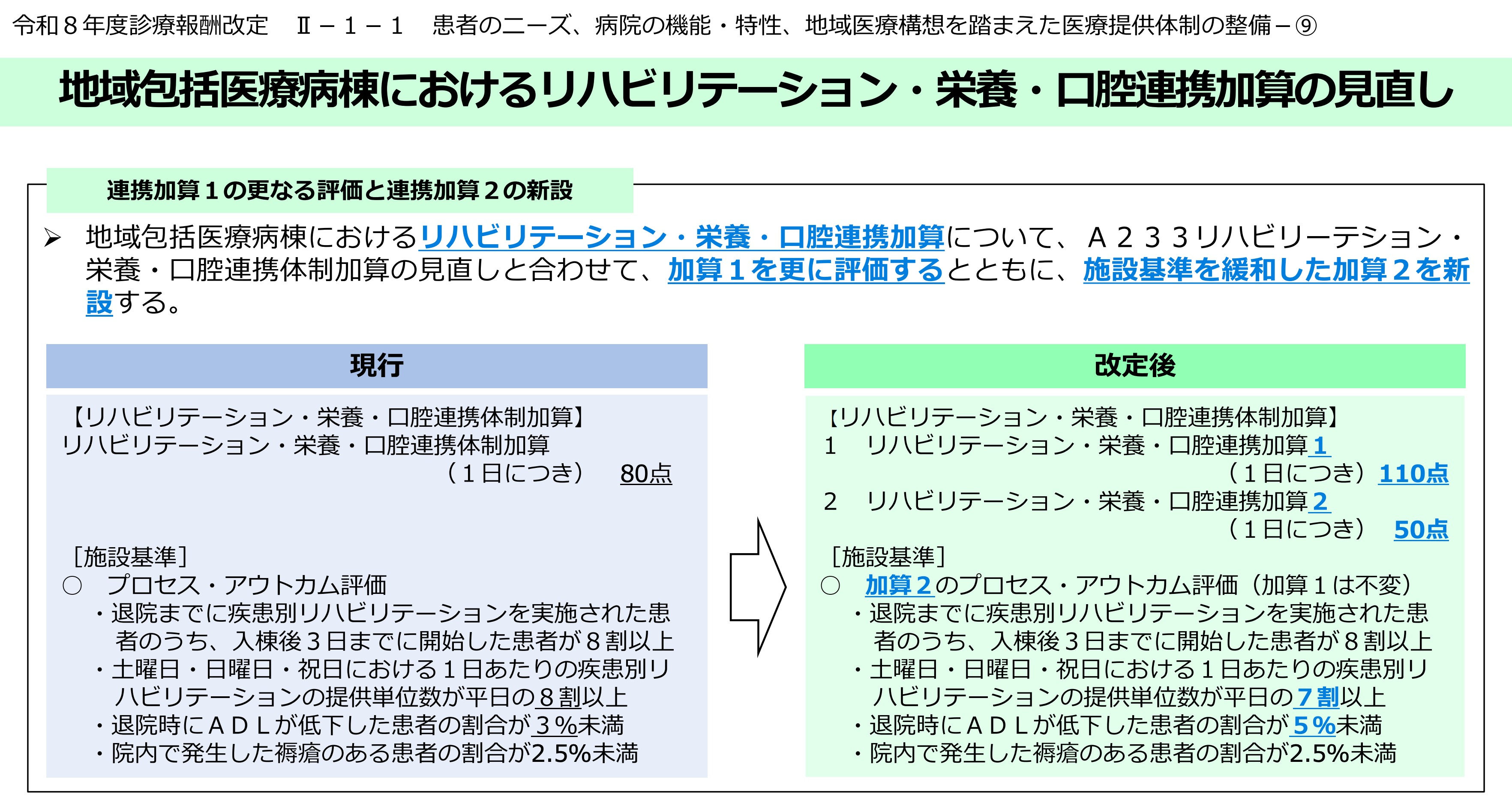 2.地域包括ケア病棟における質の高いリハビリテーション・栄養管理・口腔管理の一体的な取組を推進する観点から、地域包括ケア病棟においてもリハビリテーション・栄養・口腔連携加算を算定可能とする。また、当該加算を算定する患者について、入院栄養食事指導料及び栄養情報連携料の算定を可能とする。