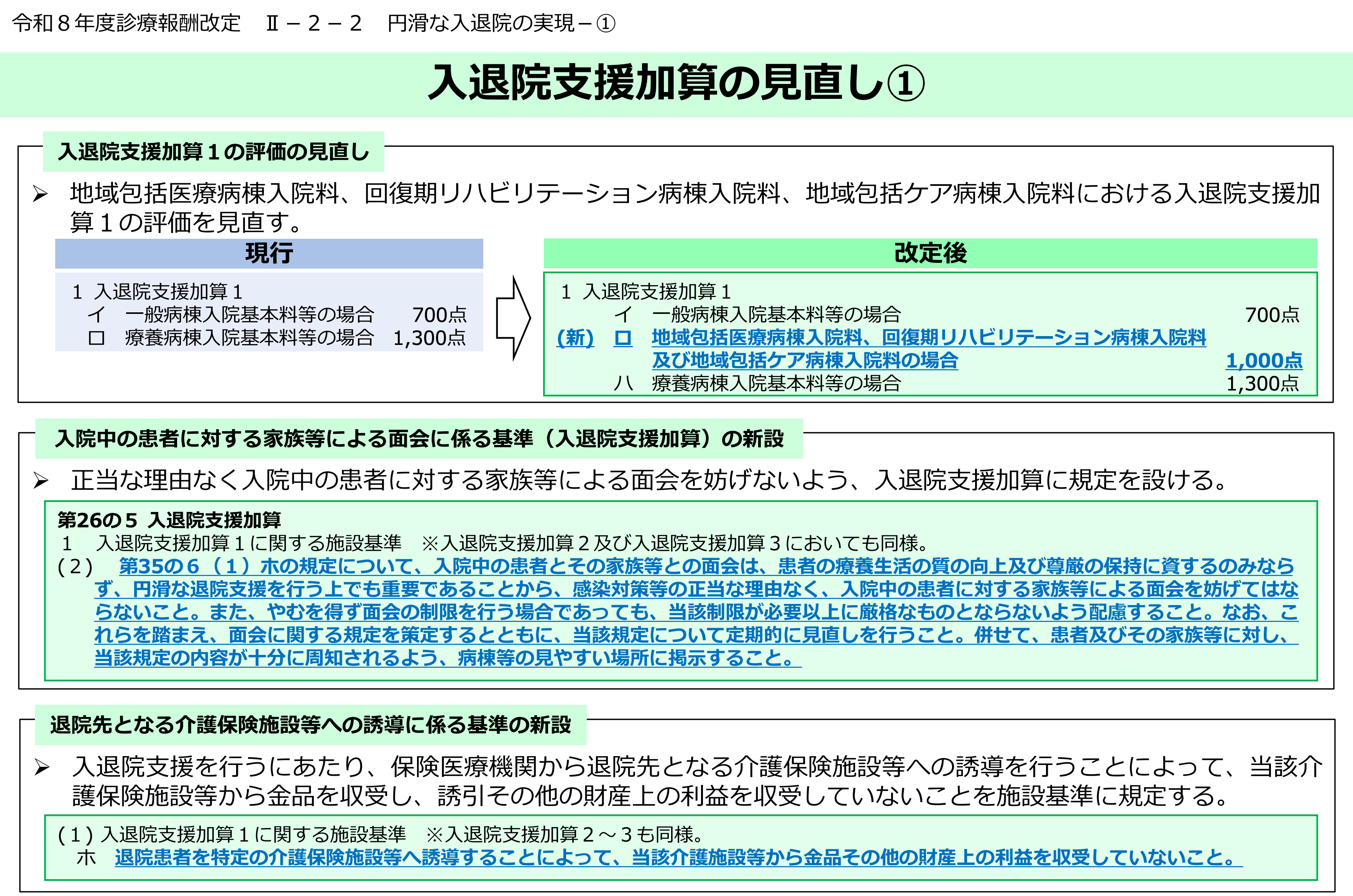 | 【入退院支援加算(退院時1回)】 1 入退院支援加算1 イ 一般病棟入院基本料等の場合 700点 ロ 地域包括医療病棟入院料、回復期リハビリテーション病棟入院料及び地域包括ケア病棟入院料の場合 1,000点 ハ 療養病棟入院基本料等の場合 1,300点 2・3 (略) | 【入退院支援加算(退院時1回)】 1 入退院支援加算1 イ 一般病棟入院基本料等の場合 700点 (新設) ロ 療養病棟入院基本料等の場合 1,300点 2・3 (略) |
