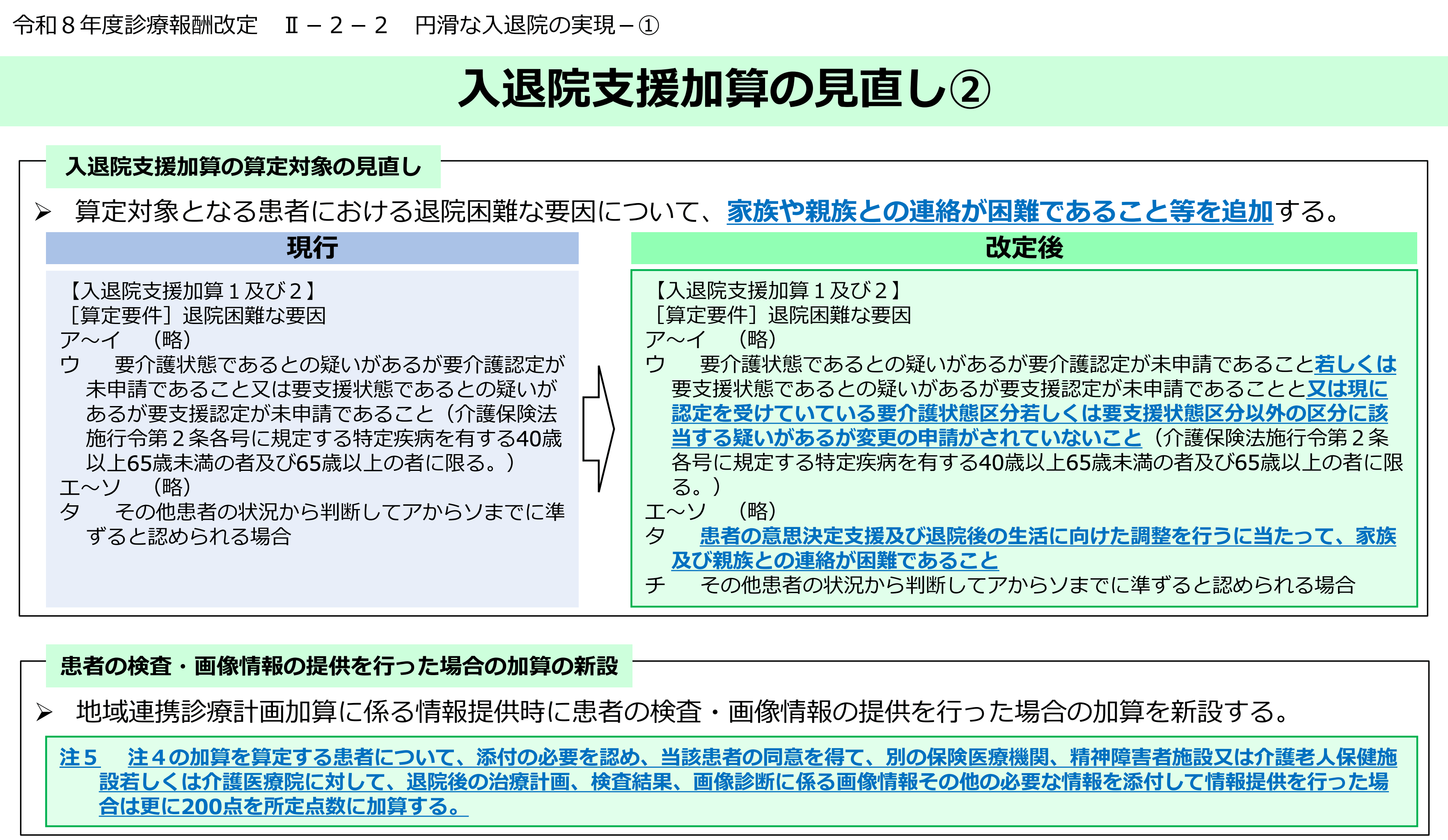 | 【入退院支援加算】 [算定要件] (1)(略) (2) 入退院支援加算1にあっては、入退院支援及び地域連携業務に専従する職員(以下「入退院支援職員」という。)を各病棟に専任で配置し、原則として入院後3日以内に患者の状況を把握するとともに退院困難な要因を有している患者を抽出する。また、入退院支援加算2にあっては、患者の入院している病棟等において、原則として入院後7日以内に退院困難な要因を有している患者を抽出する。なお、ここでいう退院困難な要因とは、以下のものである。 ア・イ (略) ウ 要介護状態であるとの疑いがあるが要介護認定が未申請であること若しくは要支援状態であるとの疑いがあるが要支援認定が未申請であること又は現に認定を受けていているが、認定を受けている要介護状態区分若しくは要支援状態区分以外の区分に該当する疑いがあるが変更の申請がされていないこと(介護保険法施行令第2条各号に規定する特定疾病を有する40歳以上65歳未満の者及び65歳以上の者に限る。) エ~ソ(略) タ 患者の意思決定支援及び退院後の生活に向けた調整を行うに当たって、家族及び親族との連絡が困難であること | 【入退院支援加算】 [算定要件] (1)(略) (2) 入退院支援加算1にあっては、入退院支援及び地域連携業務に専従する職員(以下「入退院支援職員」という。)を各病棟に専任で配置し、原則として入院後3日以内に患者の状況を把握するとともに退院困難な要因を有している患者を抽出する。また、入退院支援加算2にあっては、患者の入院している病棟等において、原則として入院後7日以内に退院困難な要因を有している患者を抽出する。なお、ここでいう退院困難な要因とは、以下のものである。 ア・イ (略) ウ 要介護状態であるとの疑いがあるが要介護認定が未申請であること又は要支援状態であるとの疑いがあるが要支援認定が未申請であること エ~ソ(略) (新設) |