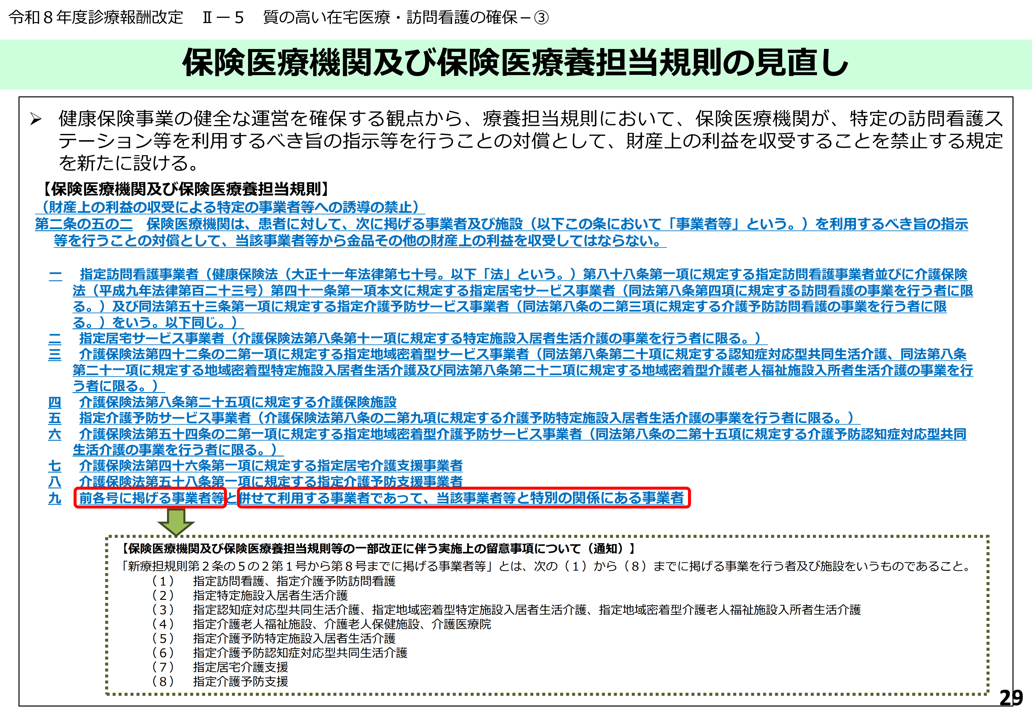 | 【保険医療機関及び保険医療養担当規則】 (財産上の利益の収受による特定の事業者等への誘導の禁止) 第二条の五の二 保険医療機関は、患者に対して、次に掲げる事業者及び施設(以下この条において「事業者等」という。)を利用するべき旨の指示等を行うことの対償として、当該事業者等から金品その他の財産上の利益を収受してはならない。 一 指定訪問看護事業者(健康保険法(大正十一年法律第七十号。以下「法」という。)第八十八条第一項に規定する指定訪問看護事業者並びに介護保険法(平成九年法律第百二十三号)第四十一条第一項本文に規定する指定居宅サービス事業者(同法第八条第四項に規定する訪問看護の事業を行う者に限る。)及び同法第五十三条第一項に規定する指定介護予防サービス事業者(同法第八条の二第三項に規定する介護予防訪問看護の事業を行う者に限る。)をいう。以下同じ。) 二 指定居宅サービス事業者(介護保険法第八条第十一項に規定する特定施設入居者生活介護の事業を行う者に限る。) 三 介護保険法第四十二条の二第一項に規定する指定地域密着型サービス事業者(同法第八条第二十項に規定する認知症対応型共同生活介護、同法第八条第二十一項に規定する地域密着型特定施設入居者生活介護及び同法第八条第二十二項に規定する地域密着型介護老人福祉施設入所者生活介護の事業を行う者に限る。) 四 介護保険法第八条第二十五項に規定する介護保険施設 五 指定介護予防サービス事業者(介護保険法第八条の二第九項に規定する介護予防特定施設入居者生活介護の事業を行う者に限る。) 六 介護保険法第五十四条の二第一項に規定する指定地域密着型介護予防サービス事業者(同法第八条の二第十五項に規定する介護予防認知症対応型共同生活介護の事業を行う者に限る。) 七 介護保険法第四十六条第一項に規定する指定居宅介護支援事業者 八 介護保険法第五十八条第一項に規定する指定介護予防支援事業者 九 前各号に掲げる事業者等と併せて利用する事業者であって、当該事業者等と特別の関係にある事業者 ※ 高齢者の医療の確保に関する法律の規定による療養の給付等の取扱い及び担当に関する基準についても同様。 | 【保険医療機関及び保険医療養担当規則】 (新設) |