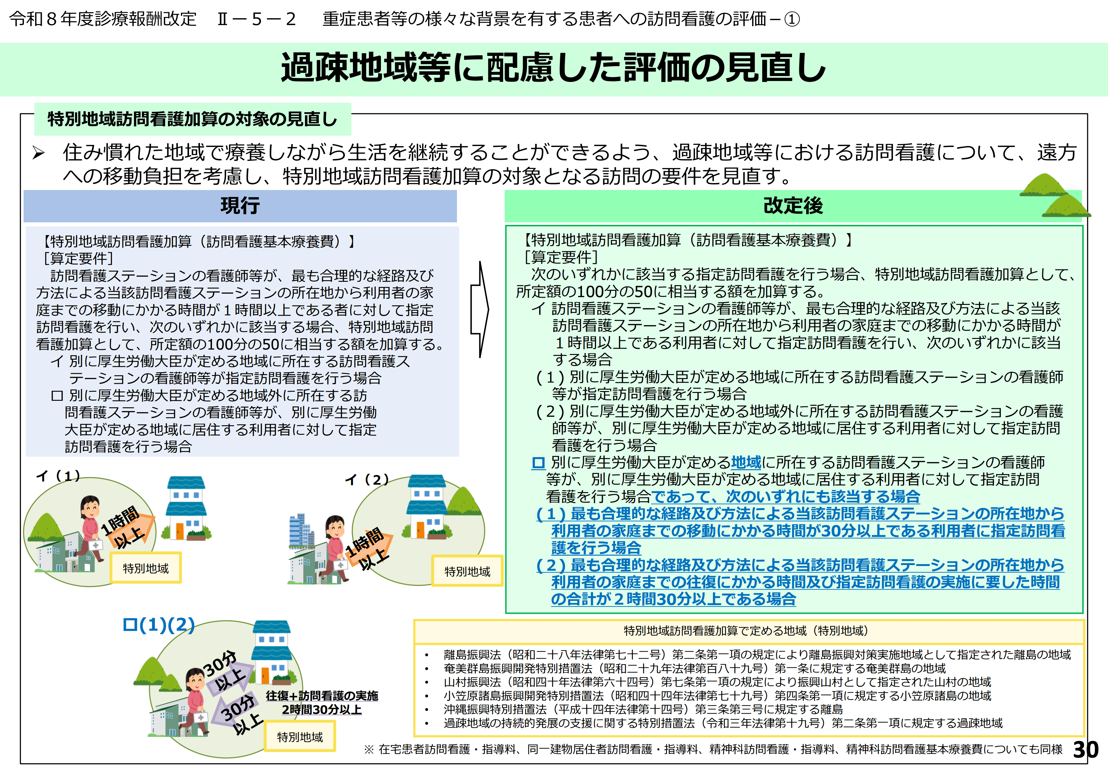 | 【特別地域訪問看護加算(訪問看護基本療養費)】 [算定要件] 注8 次のいずれかに該当する指定訪問看護を行う場合、特別地域訪問看護加算として、所定額の100分の50に相当する額を加算する。 | 【特別地域訪問看護加算(訪問看護基本療養費)】 [算定要件] 注8 訪問看護ステーションの看護師等が、最も合理的な経路及び方法による当該訪問看護ステーションの所在地から利用者の家庭までの移動にかかる時間が1時間以上である者に対して指定訪問看護を行い、次のいずれかに該当する場合、特別地域訪問看護加算として、所定額の100分の50に相当する額を加算する。 |