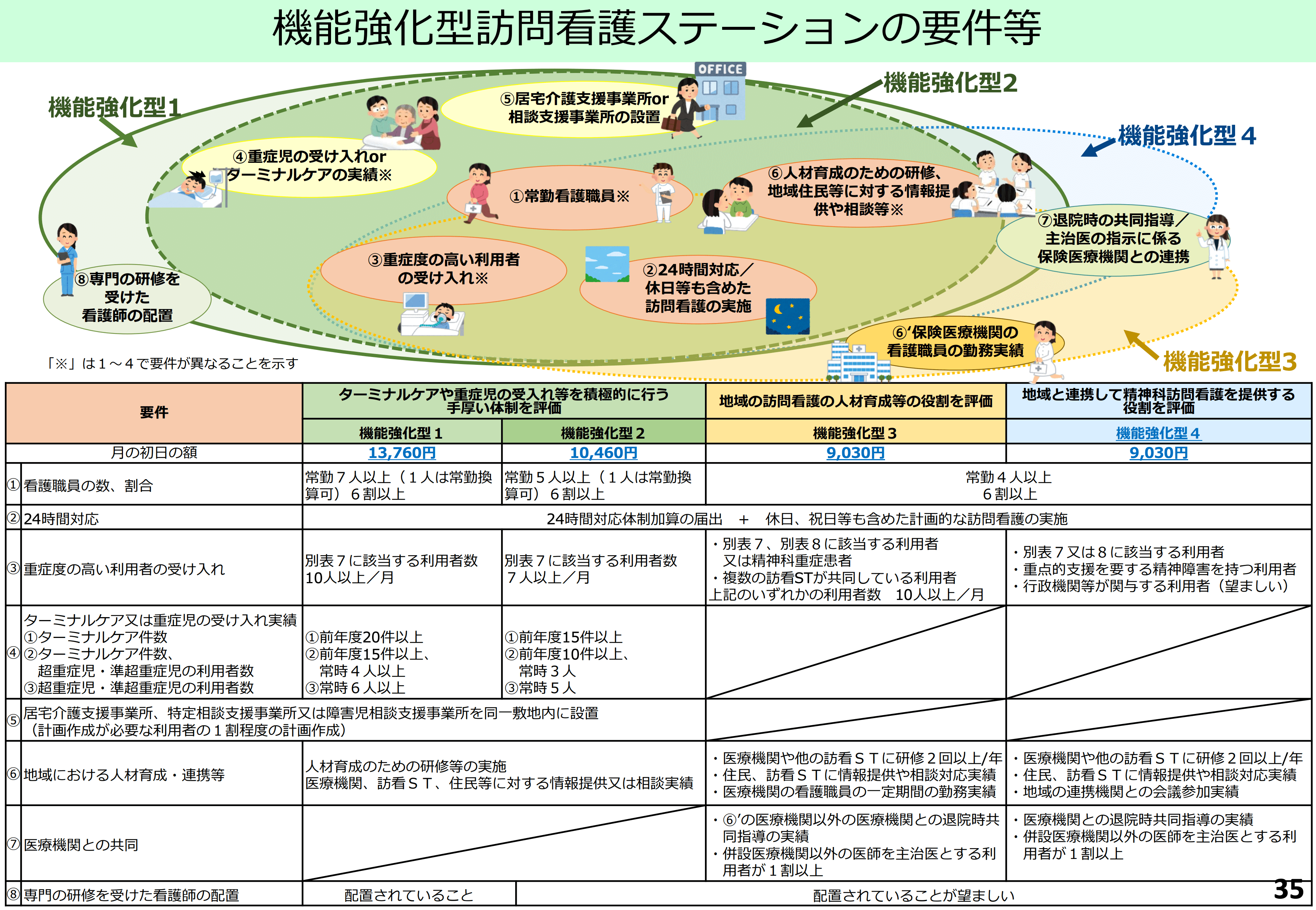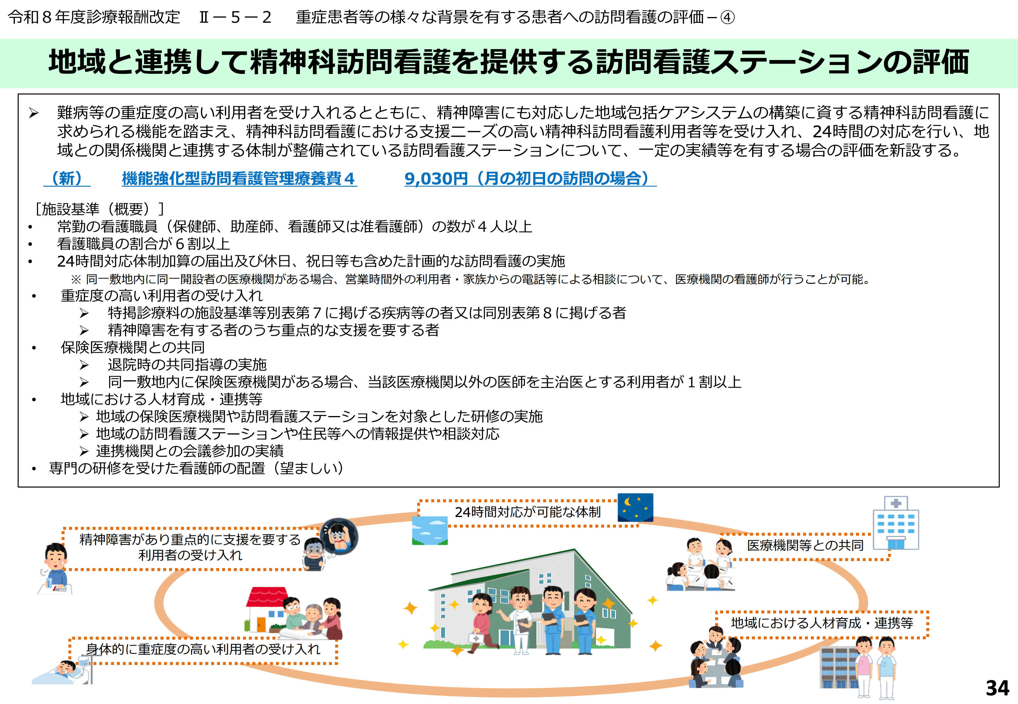 精神科訪問看護の質の向上を推進する観点から、地域の関係者と連携して支援ニーズの高い利用者に対して精神科訪問看護を提供する等の役割を担う訪問看護ステーションについて、機能強化型訪問看護ステーションとして新たな評価を行う。
