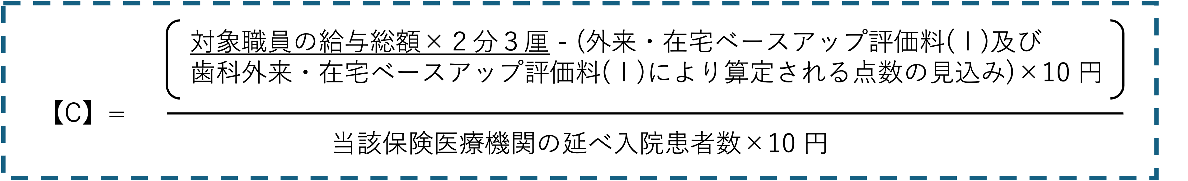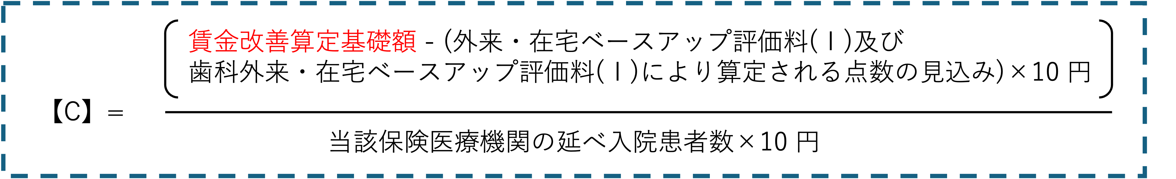 (4) 入院ベースアップ評価料の保険医療機関ごとの区分については、当該保険医療機関における賃金改善算定基礎額、外来・在宅ベースアップ評価料(Ⅰ)及び歯科外来・在宅ベースアップ評価料(Ⅰ)により算定される点数の見込み並びに延べ入院患者数の見込みを用いて次の式により算出した数【C】に基づき、別表5に従い該当する区分を届け出ること。