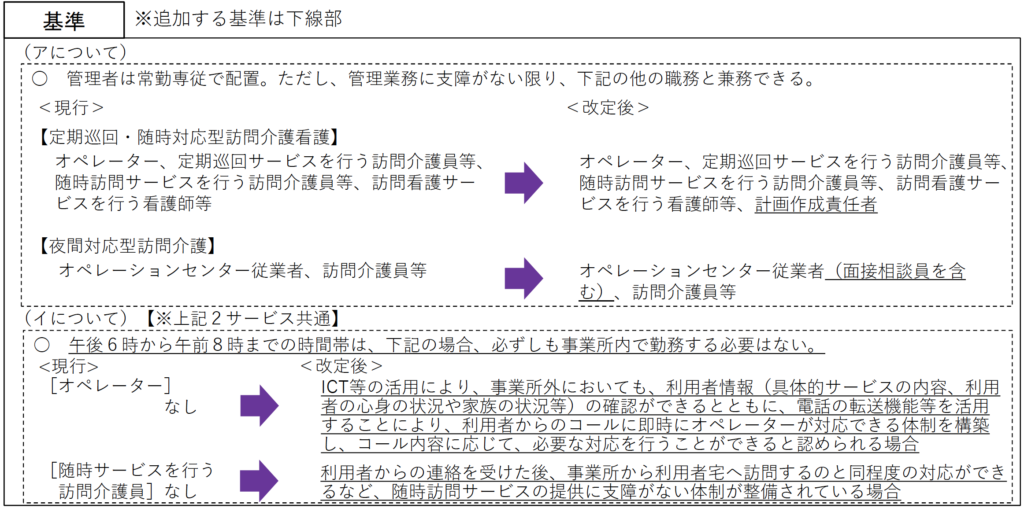 ア 計画作成責任者(定期巡回・随時対応型訪問介護看護)及び面接相談員(夜間対応型訪問介護)について、管理者との兼務が可能であること。