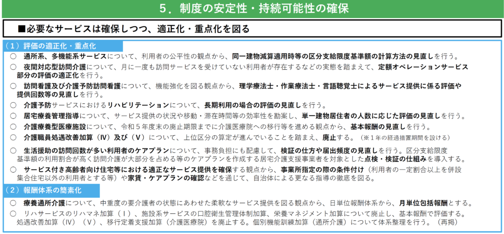※3(1)2リハビリテーションマネジメント加算の見直し、9通所介護における個別機能訓練加算の見直し、14施設系サービスにおける口腔衛生管理の強化、15施設系サービスにおける栄養マネジメントの充実、5(1)9介護医療院の移行定着支援加算の廃止、10介護職員処遇改善加算(IV)及び(V)の廃止も参照。
