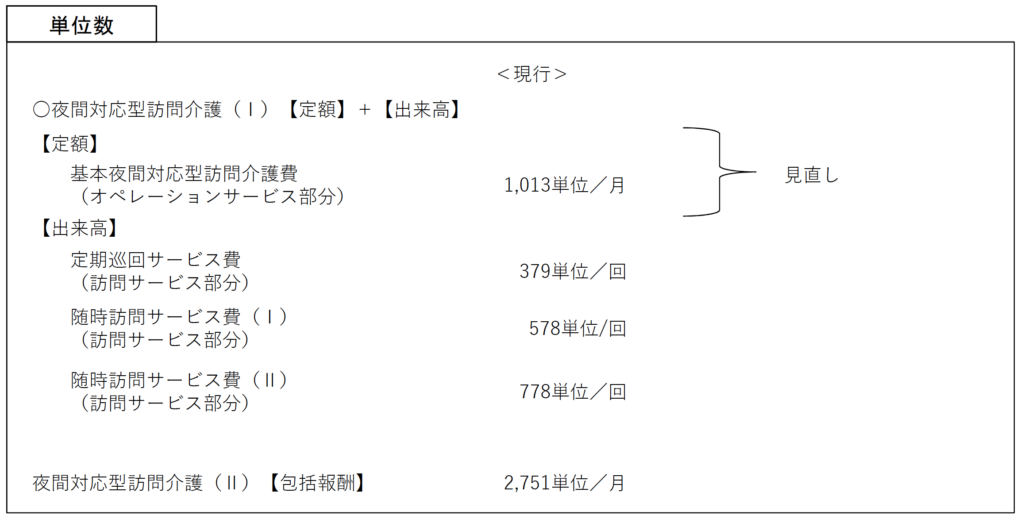 定額のオペレーションサービス部分(基本夜間対応型訪問介護費)と出来高の訪問サービス部分(定期巡回サービス費及び随時訪問サービス費)で構成される夜間対応型訪問介護費(I)について、月に一度も訪問サービスを受けていない利用者が存在するなどの給付実態を踏まえて、定額オペレーションサービス部分の評価の適正化を行う。