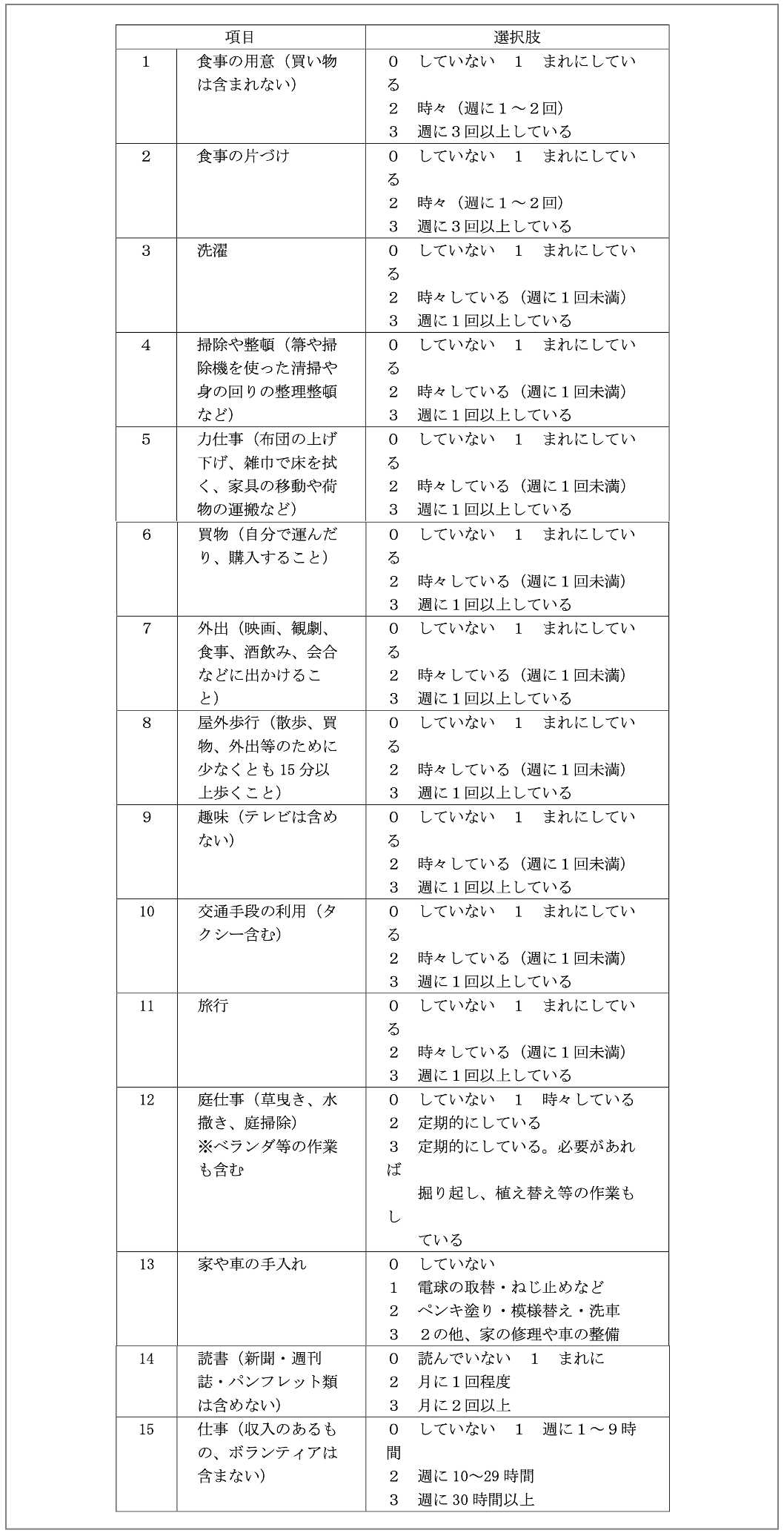 - 利用者の基本的動作能力、応用的動作能力及び社会適応能力等の日常生活能力並びにその能力の改善の可能性