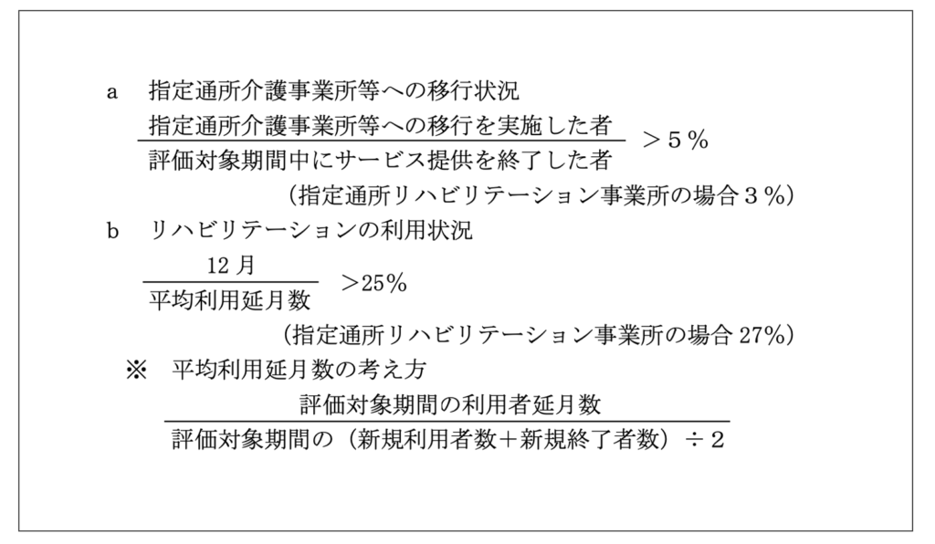 - 指定通所介護等への移行とは、指定通所リハビリテーション、指定介護予防通所リハビリテーション(指定通所リハビリテーションの場合にあっては、指定通所リハビリテーション間及び指定介護予防通所リハビリテーション間の移行は除く。)や指定通所介護、指定地域密着型通所介護、指定認知症対応型通所介護、指定小規模多機能型居宅介護、指定看護小規模多機能型居宅介護、指定介護予防認知症対応型通所介護、指定介護予防小規模多機能型居宅介護、介護予防・日常生活支援総合事業における通所事業や一般介護予防事業、居宅における家庭での役割を担うこと、就労であること。