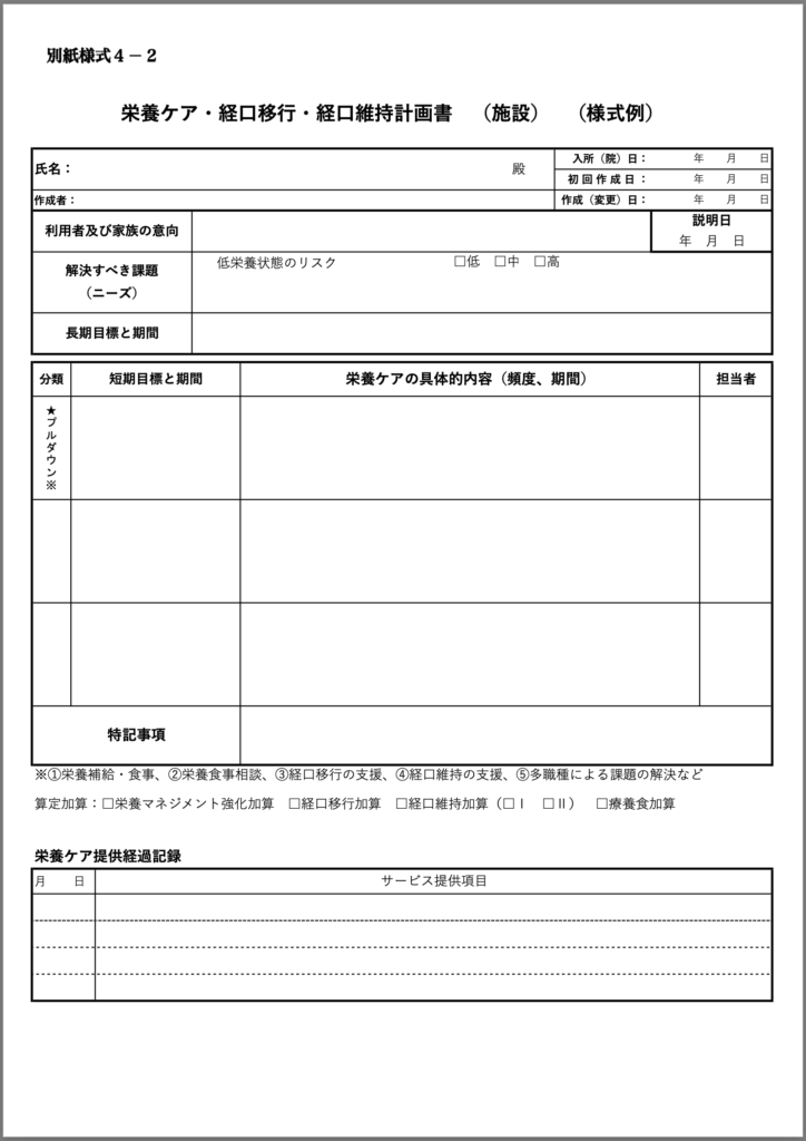 経口移行加算に係る経口移行計画及び経口維持加算に係る経口維持計画については、別紙様式4-2 栄養ケア・経口移行・経口維持計画書 (施設) の様式例を参照の上、栄養ケア計画と一体的に作成する。なお、指定介護老人福祉施設の人員、設備及び運営に関する基準第12条若しくは第49条において準用する第12条、介護老人保健施設の人員、施設及び設備並びに運営に関する基準第14条若しくは第50条において準用する第14条又は健康保険法等の一部を改正する法律附則第130条の2第1項の規定によりなおその効力を有するものとされた指定介護療養型医療施設の人員、設備及び運営に関する基準第15条若しくは第50条において準用する第15条において作成することとされている各計画の中に、経口移行計画又は経口維持計画に相当する内容をそれぞれ記載する場合は、その記載をもって経口移行計画又は経口維持計画の作成に代えることができるものとする。