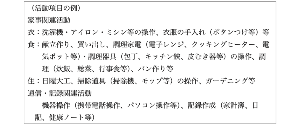 ア 利用者自らが日常生活上の課題に応じて活動を選択できるよう、次に掲げる活動項目を参考に、日常生活に直結した活動項目を複数準備し、時間割を組むこと。