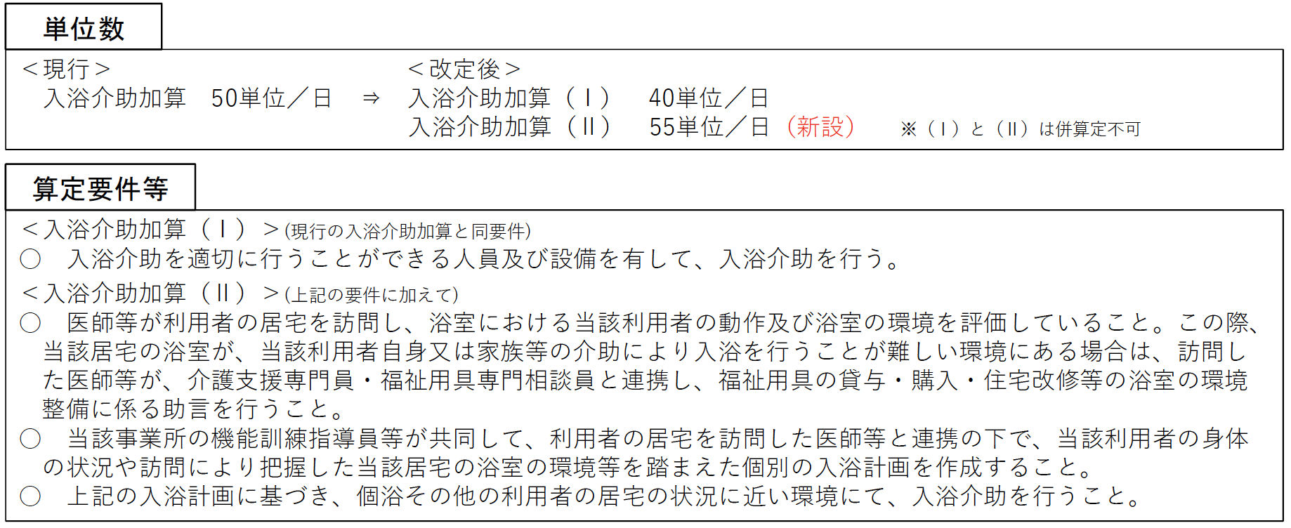 別に厚生労働大臣が定める基準に適合しているものとして都道府県知事に届け出て当該基準による入浴介助を行った場合は、当該基準に掲げる区分に従い、1日につき次に掲げる単位数を所定単位数に加算する。ただし、次に掲げるいずれかの加算を算定している場合においては、次に掲げるその他の加算は算定しない。
