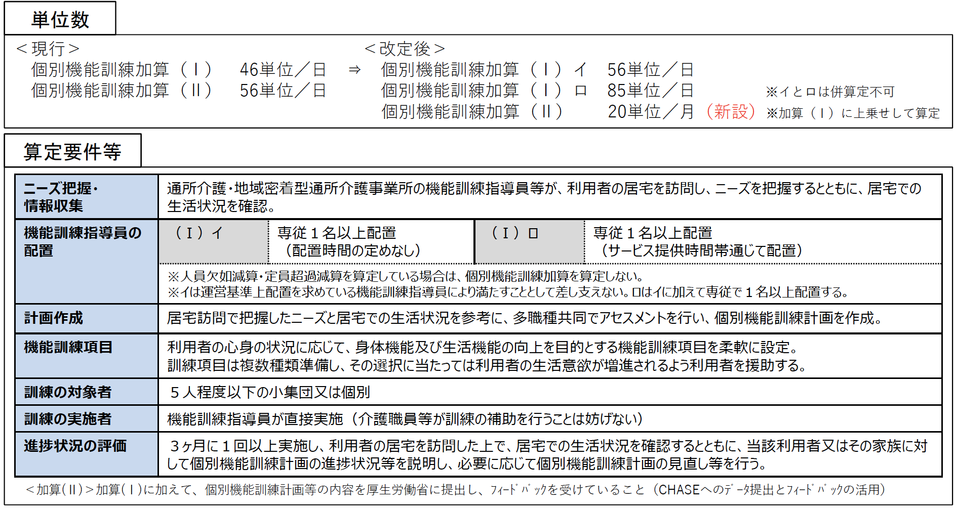別に厚生労働大臣が定める基準に適合しているものとして都道府県知事に届け出た指定通所介護事業所において、外部との連携により、利用者の身体の状況等の評価を行い、かつ、個別機能訓練計画を作成した場合には、当該基準に掲げる区分に従い、(1)については、利用者の急性増悪等により当該個別機能訓練計画を見直した場合を除き3月に1回を限度として、1月につき、(2)については1月につき、次に掲げる単位数を所定単位数に加算する。ただし、次に掲げるいずれかの加算を算定している場合においては、次に掲げるその他の加算は算定しない。また、注11を算定している場合、(1)は算定せず、(2)は1月につき100単位を所定単位数に加算する。