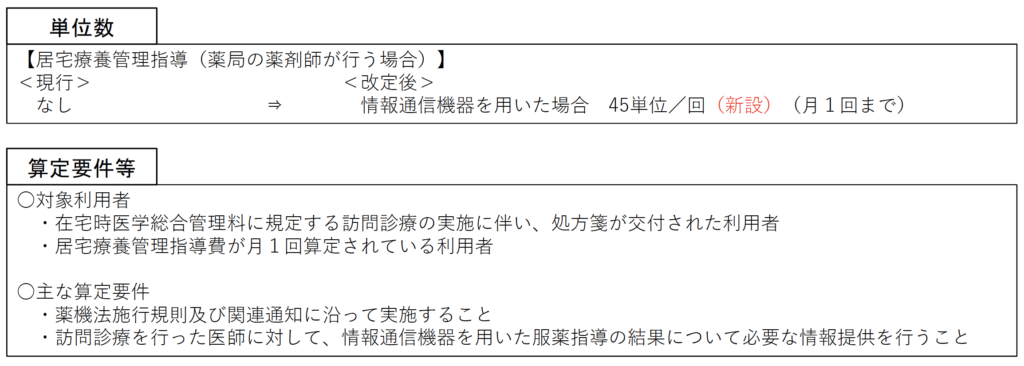 薬剤師による居宅療養管理指導について、診療報酬の例も踏まえて、新たに情報通信機器を用いた服薬指導の評価を創設する。 その際、対面と組み合わせて計画的に実施することとし、算定回数は現行の上限の範囲内で柔軟に設定する。