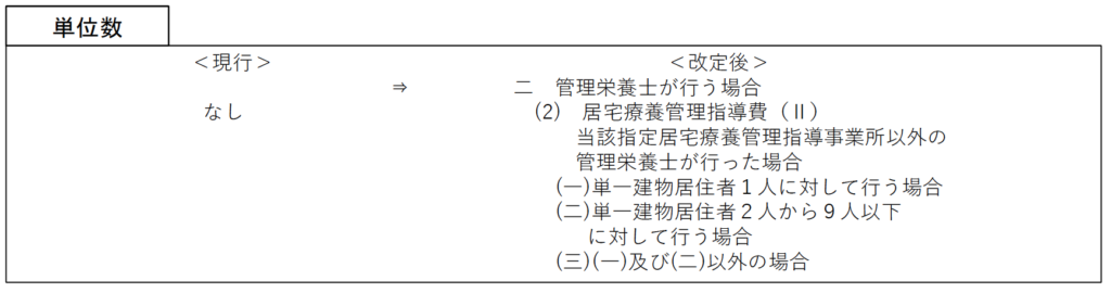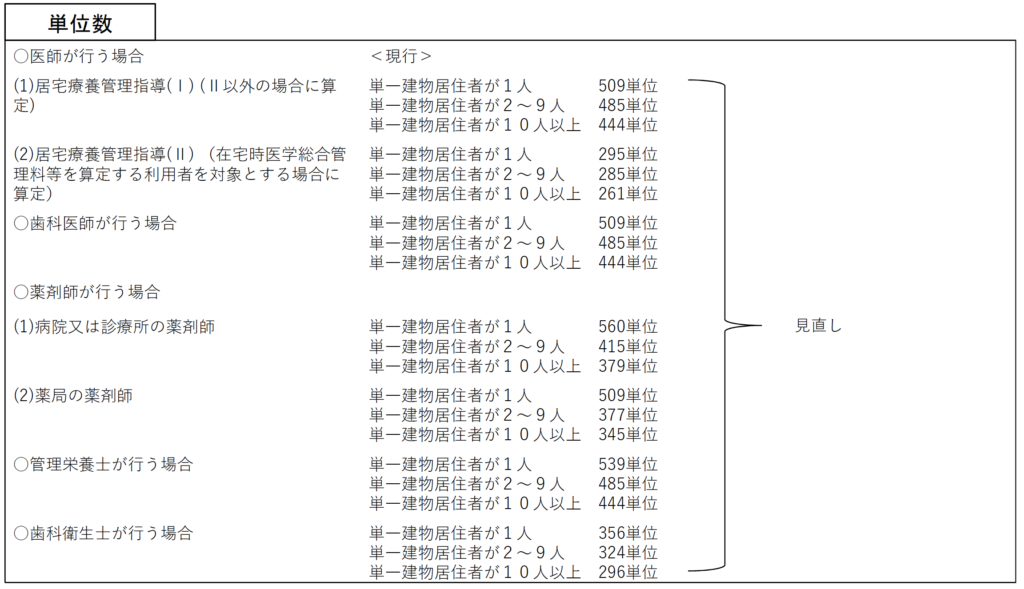 居宅療養管理指導について、サービス提供の状況や移動時間、滞在時間等の効率性を勘案し、より実態を踏まえた評価とする観点から、単一建物居住者の人数に応じた評価について見直しを行う。