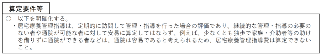 居宅療養管理指導について、在宅の利用者であって通院が困難なものに対して行うサービスであることを踏まえ、適切なサービスの提供を進める観点から、診療報酬の例を参考に、少なくとも独歩で家族・介助者等の助けを借りずに通院ができる者などは、 通院は容易であると考えられるため、これらの者については算定できないことを明確化する。