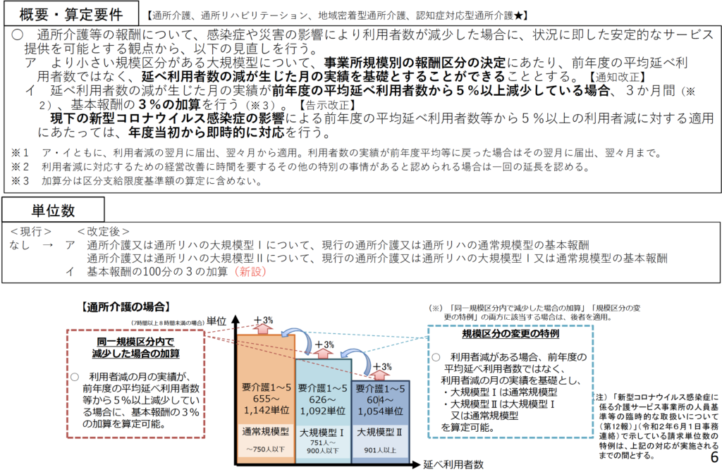通所介護等の報酬について、感染症や災害の影響により利用者が減少した場合に、状況に即した安定的なサービス提供を可能とする観点から、以下の通り見直しを行う。