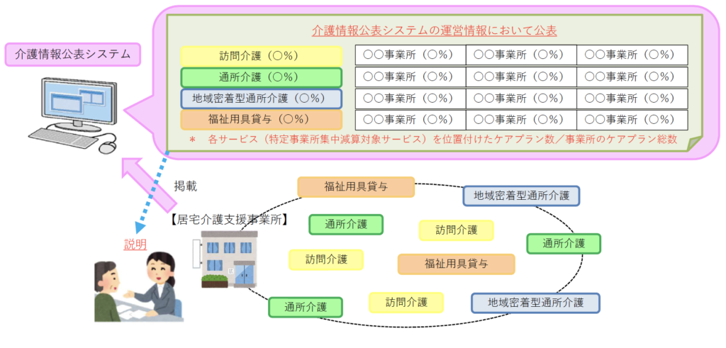 イ ケアマネジメントの公正中立性の確保を図る観点から、事業者に、以下について、利用者に説明を行うとともに、介護サービス情報公表制度において公表することを求める 。 ・前6か月間に作成したケアプランにおける、訪問介護、通所介護、地域密着型通所介護、福祉用具貸与の各サービスの利用割合 ・前6か月間に作成したケアプランにおける、訪問介護、通所介護、地域密着型通所介護、福祉用具貸与の各サービスごとの、同一事業者によって提供されたものの割合