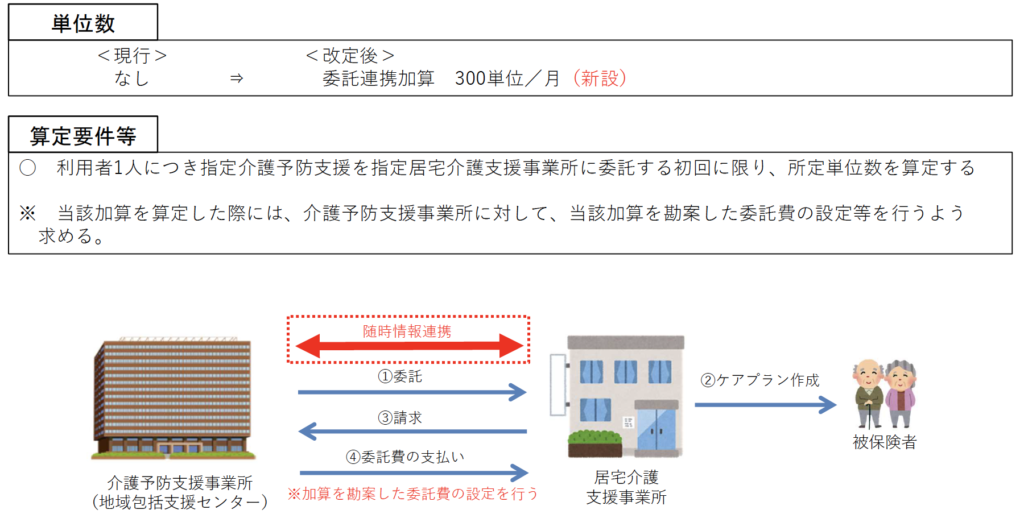 介護予防支援について、地域包括支援センターが居宅介護支援事業者に外部委託を行いやすい環境の整備を進める観点から、地域包括支援センターが委託する個々のケアプランについて、委託時における、居宅介護支援事業者との適切な情報連携等を評価する新たな加算を創設する。