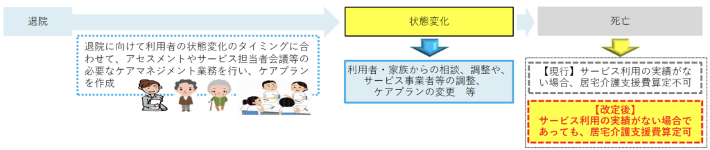 居宅介護支援について、看取り期における適切な居宅介護支援の提供や医療と介護の連携を推進する観点から、居宅サービス等の利用に向けて介護支援専門員が利用者の退院時等にケアマネジメント業務を行ったものの利用者の死亡によりサービス利用に至らなかった場合 に、モニタリングやサービス担当者会議における検討等必要なケアマネジメント業務や給付管理のための準備が行われ、介護保険サービスが提供されたものと同等に取り扱うことが適当と認められるケースについて、居宅介護支援の基本報酬の算定を可能とする 見直しを行う。