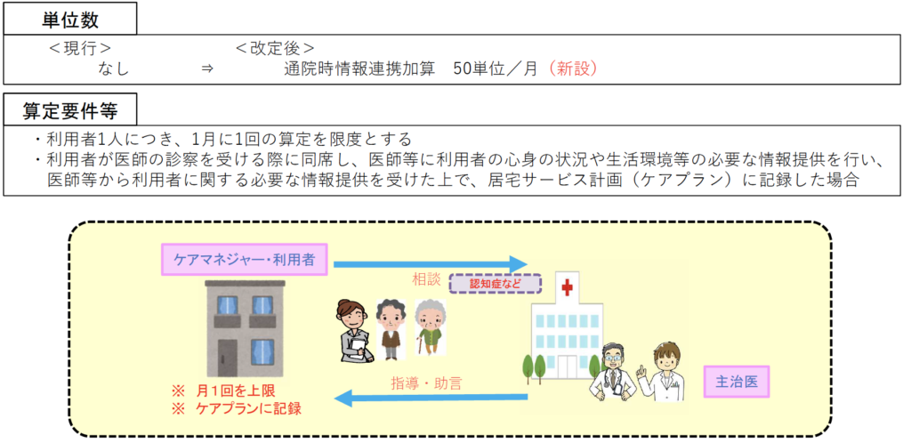 居宅介護支援について、医療と介護の連携を強化し、適切なケアマネジメントの実施やケアマネジメントの質の向上を進める観点から、利用者が医療機関において医師の診察を受ける際に介護支援専門員が同席し、医師等と情報連携を行い 、当該情報を踏まえてケアマネジメントを行うことを一定の場合に評価する新たな加算を創設 する。