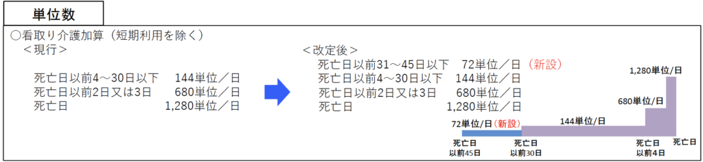 イ 算定日数期間を超えて看取りに係るケアを行っている実態があることを踏まえ、現行の死亡日以前30日前からの算定に加えて、それ以前の一定期間の対応について、新たに評価する区分を設ける。