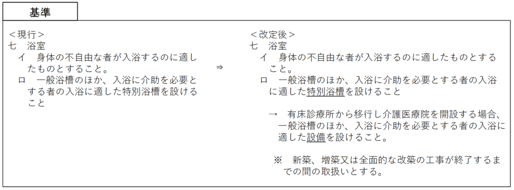 一般浴槽及び特別浴槽の設置を求める介護医療院の浴室の施設基準について、入所者への適切なサービス提供の確保に留意しつつ、介護療養病床を有する診療所から介護医療院への移行を一層促進する観点から、有床診療所から移行して介護医療院を開設する場合であって、入浴用リフトやリクライニングシャワーチェア等により、身体の不自由な者が適切に入浴できる場合は、一般浴槽以外の浴槽の設置は求めないこととする。 この取扱いは、当該事業者が施設の新築、増築又は全面的な改築の工事を行うまでの間の経過措置 とする。