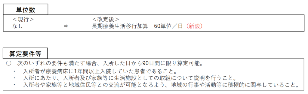 ・入所者が療養病床に長期間入院していた患者であること。 ・入所にあたり、入所者及び家族等に生活施設としての取組について説明を行うこと。 ・入所者及び家族等と地域住民等との交流が可能となるよう、 地域の行事や活動等に積極的に関与していること 。