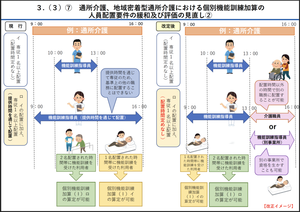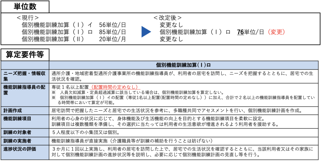 処遇改善、介護職員に限定せず事業所内で柔軟な配分を認める - 個別機能訓練加算の人員配置要件の緩和及び評価の見直し
